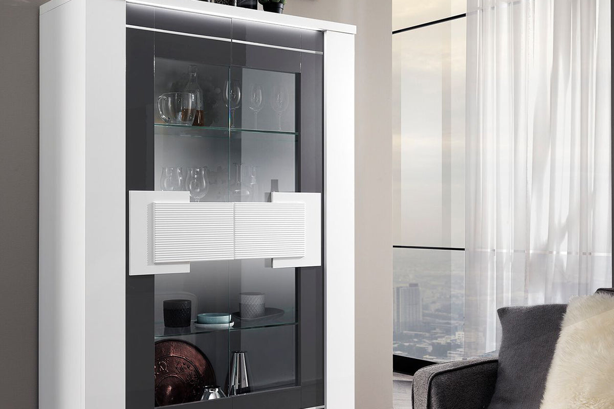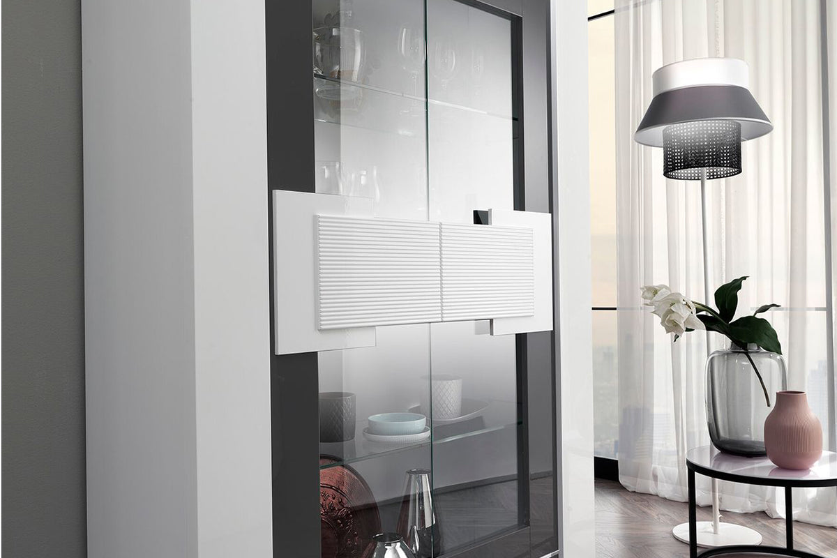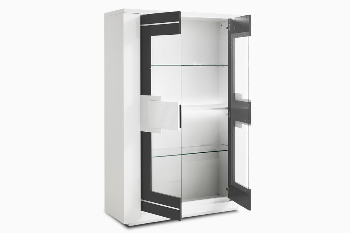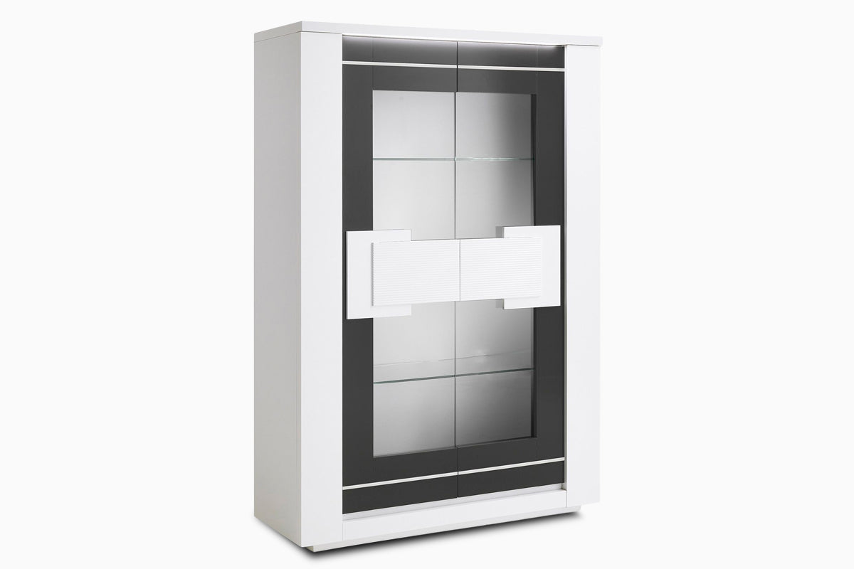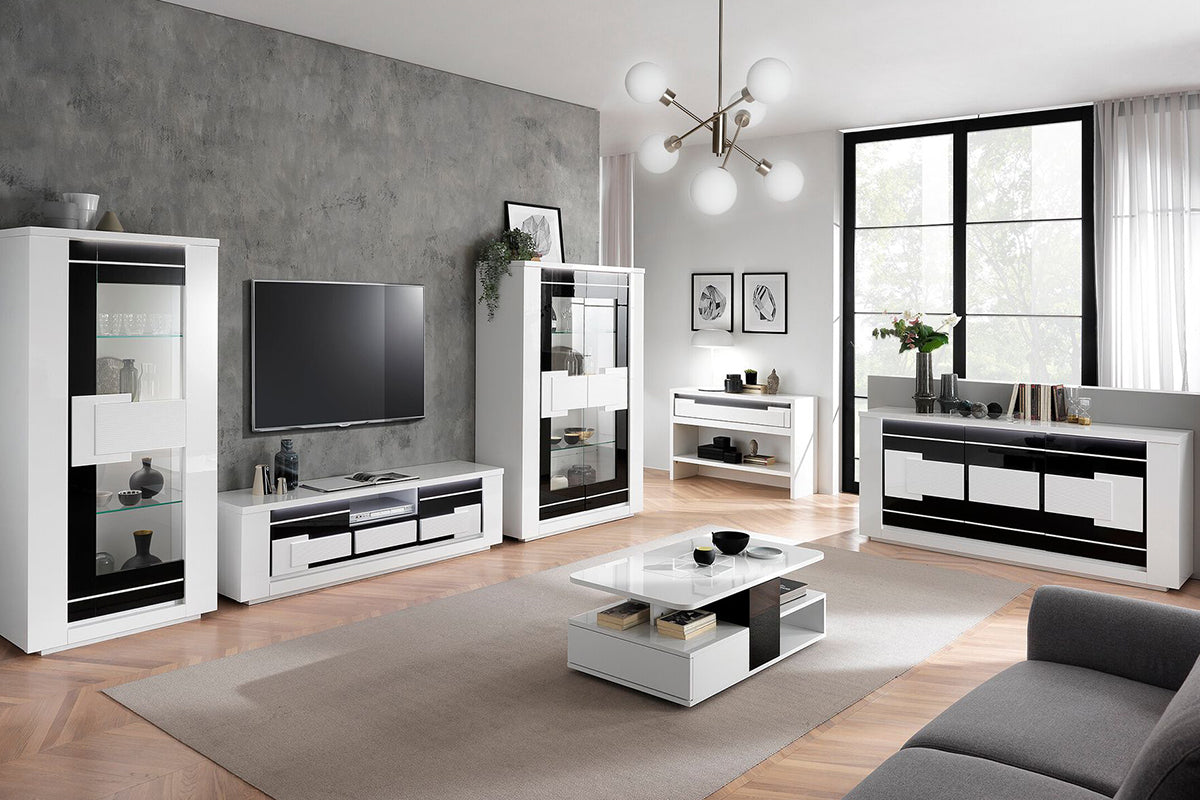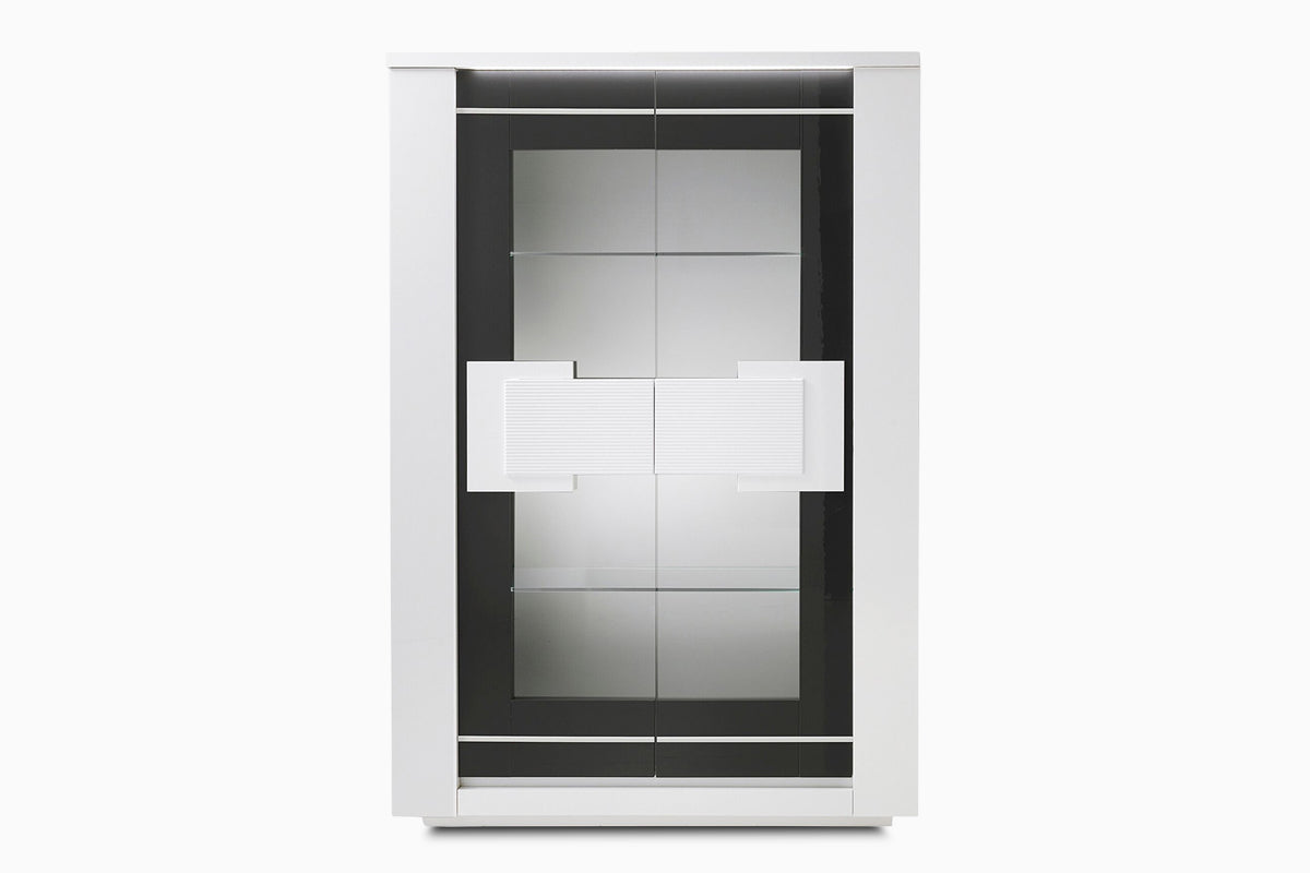 Vitrina Arriva – elegantiškas ir modernus baldas, kuris taps jūsų svetainės akcentu. Blizgūs baltos ir juodos spalvų fasadai, derinami su stiklinėmis durelėmis, suteikia šiuolaikiško lengvumo ir prabangos įspūdį. Stiklinės lentynos puikiai tinka indams, dekoracijoms ar kitiems daiktams eksponuoti, o LED apšvietimas pabrėžia jų estetiką ir sukuria jaukią atmosferą vakare. Tai funkcionali vitrina, kuri ne tik suteiks daugiau vietos daiktams, bet ir papuoš jūsų interjerą savo stilingu dizainu.