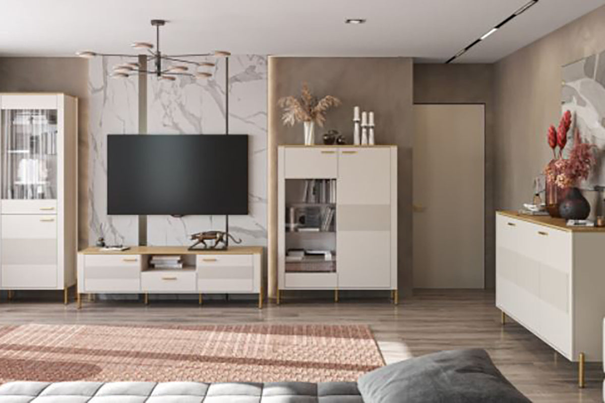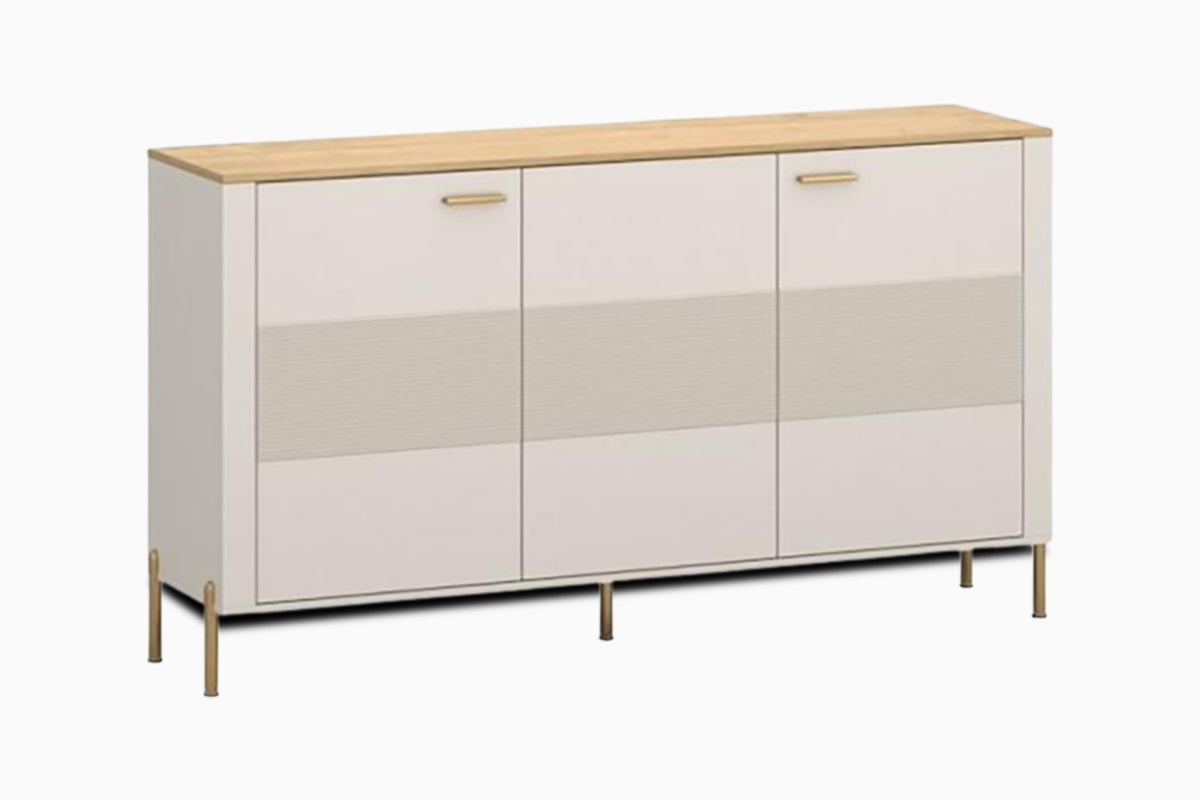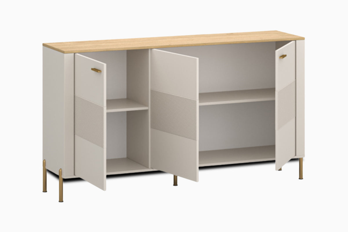 Komoda Goose – elegantiškas ir šiuolaikiškas baldas, išsiskiriantis subtiliu dizainu bei šviesių atspalvių deriniu. Švelnios linijos, auksinės detalės ir medžio imitacijos stalviršis suteikia interjerui prabangos ir jaukumo. Erdvūs skyriai leidžia patogiai laikyti daiktus, o minimalistinis stilius lengvai dera tiek moderniuose, tiek klasikinio stiliaus namuose.