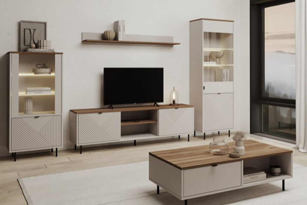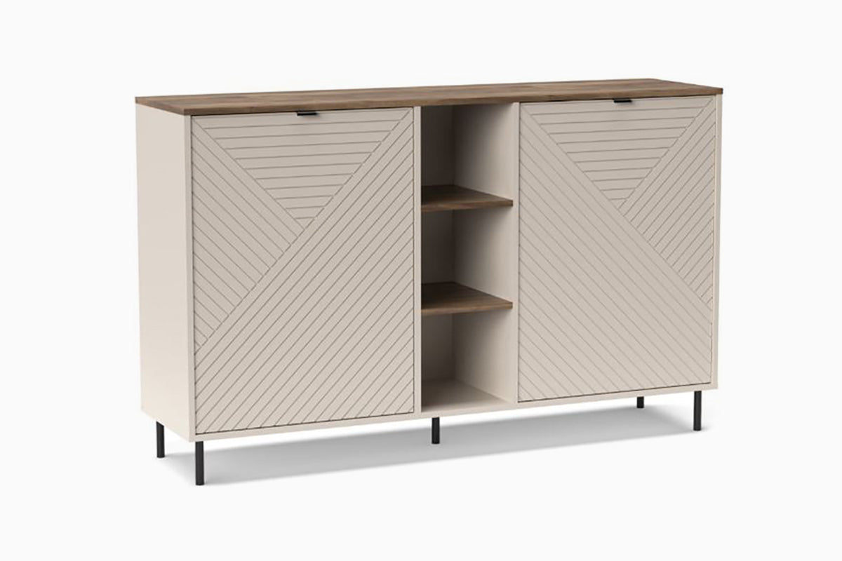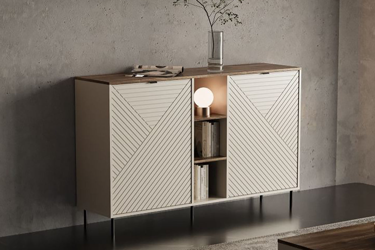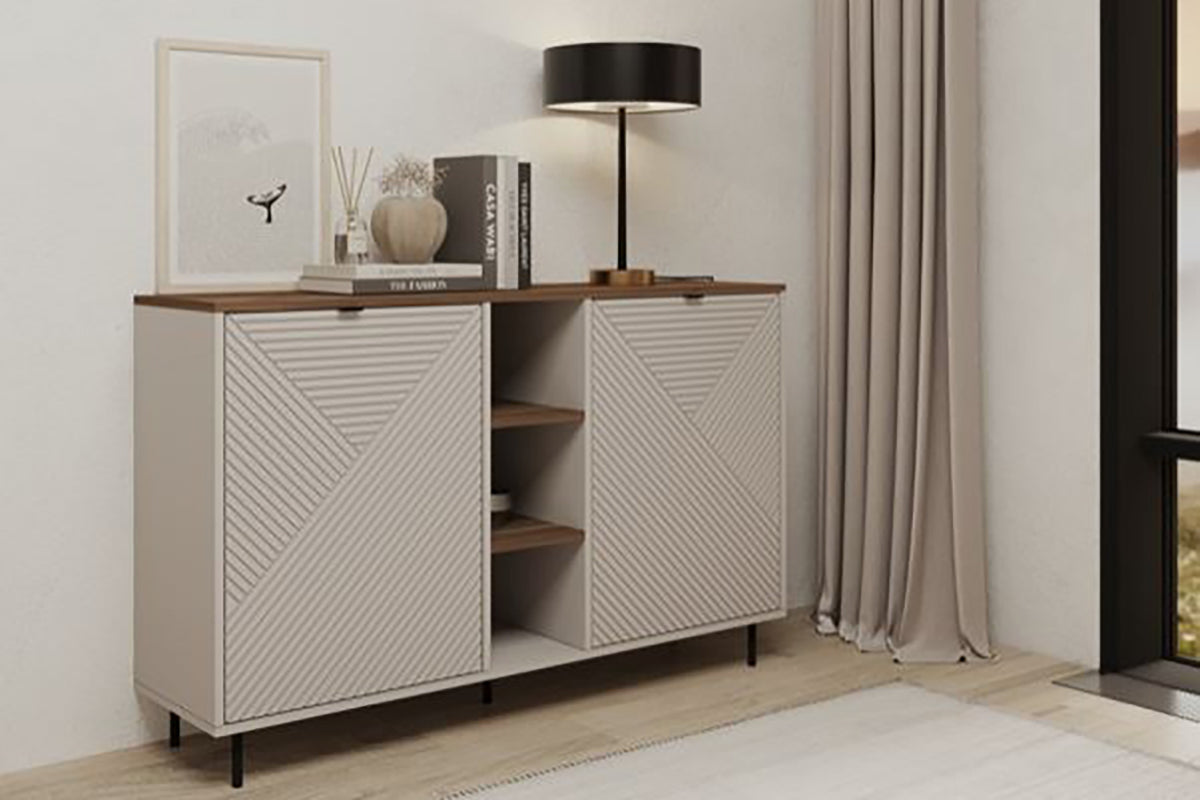 Komoda Hindi II – stilingas ir funkcionalus baldas, kuris sujungia modernų dizainą su natūraliu jaukumu. Geometrinio rašto fasadai ir atviras centrinis skyrius su lentynomis suteikia baldui išskirtinumo bei leidžia lengvai derinti prie įvairių interjerų. Medžio imitacijos stalviršis ir juodos kojelės suteikia subtilaus kontrasto, o praktiškas išdėstymas leidžia patogiai laikyti tiek kasdienius daiktus, tiek dekoratyvias detales.