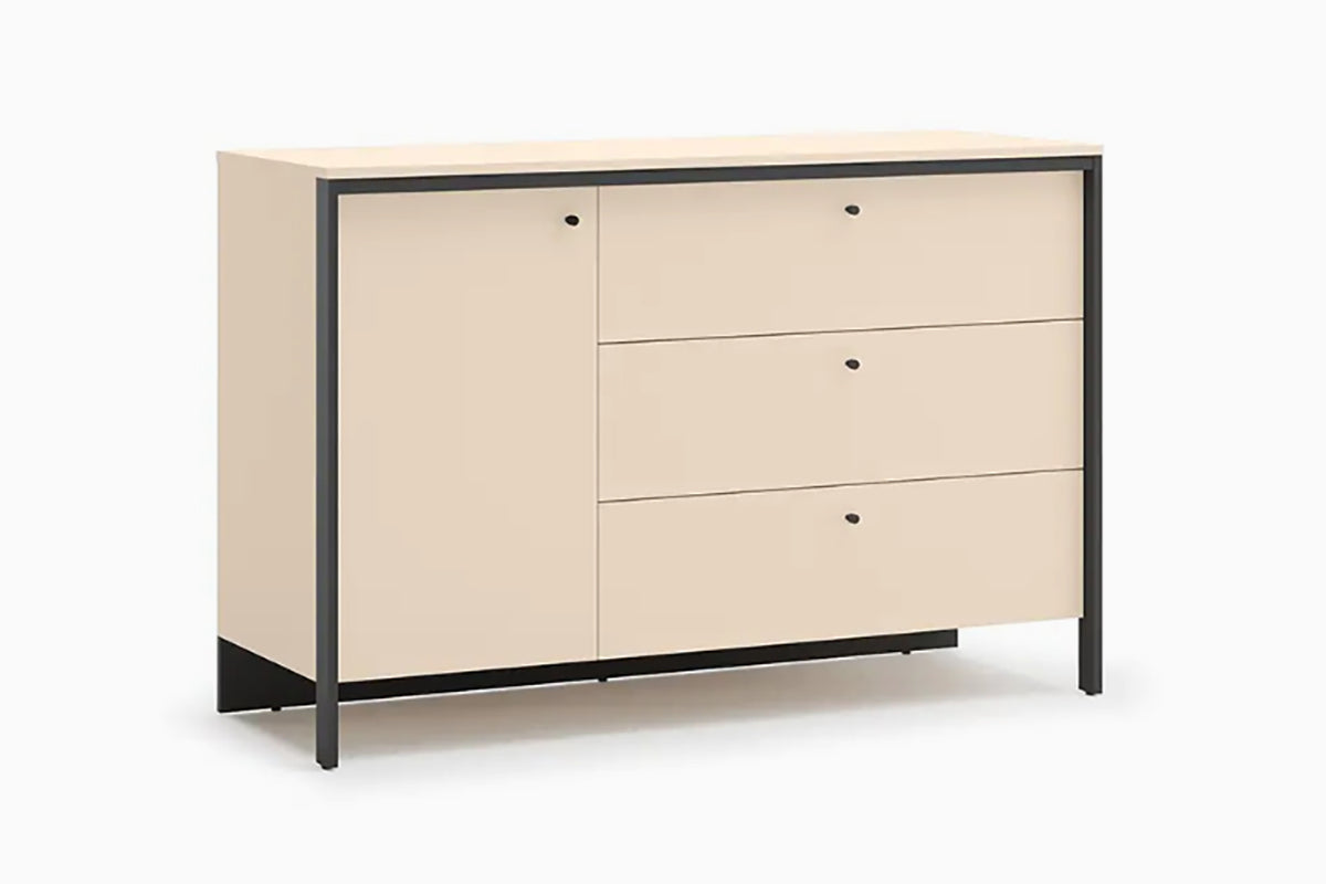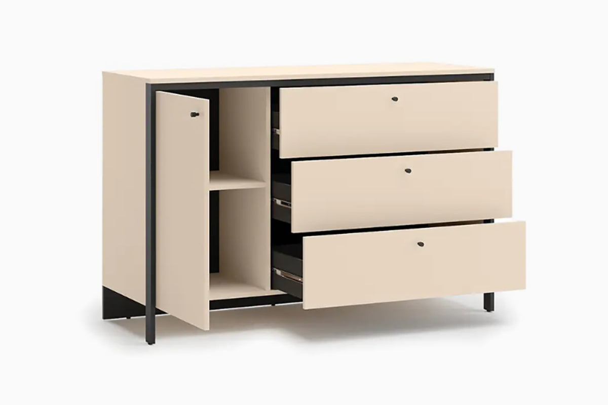 Komoda Leila – tai modernus ir praktiškas baldas, puikiai tinkantis tiek svetainei, tiek miegamajam. Derinys iš trijų stalčių ir uždaro skyriaus su lentynomis leidžia tvarkingai susidėti įvairius daiktus. Šviesus korpusas, juodi akcentai ir minimalistinės rankenėlės suteikia komodai išraiškingo, šiuolaikiško stiliaus, kuris lengvai įsilieja į bet kurį interjerą.