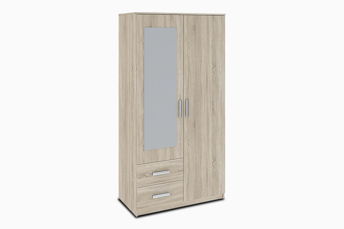Spinta Logan – praktiška dviejų durų spinta su integruotu veidrodžiu ir dviem stalčiais, puikiai tinkanti miegamajam ar prieškambariui. Viduje rasite drabužių pakabinimo skersinį ir vietą tvarkingam daiktų susidėjimui, o šviesus medžio dekoras lengvai derės prie įvairių interjerų.