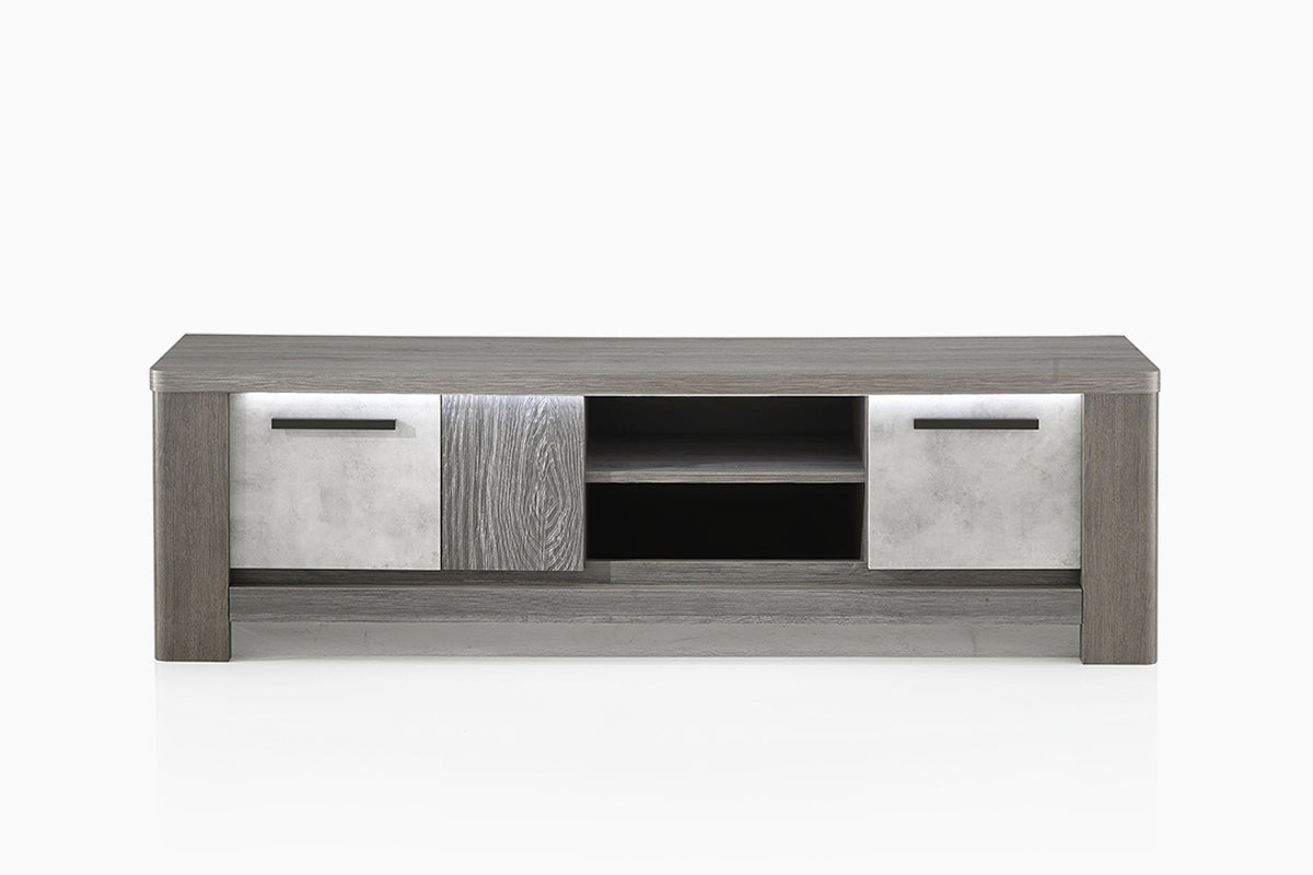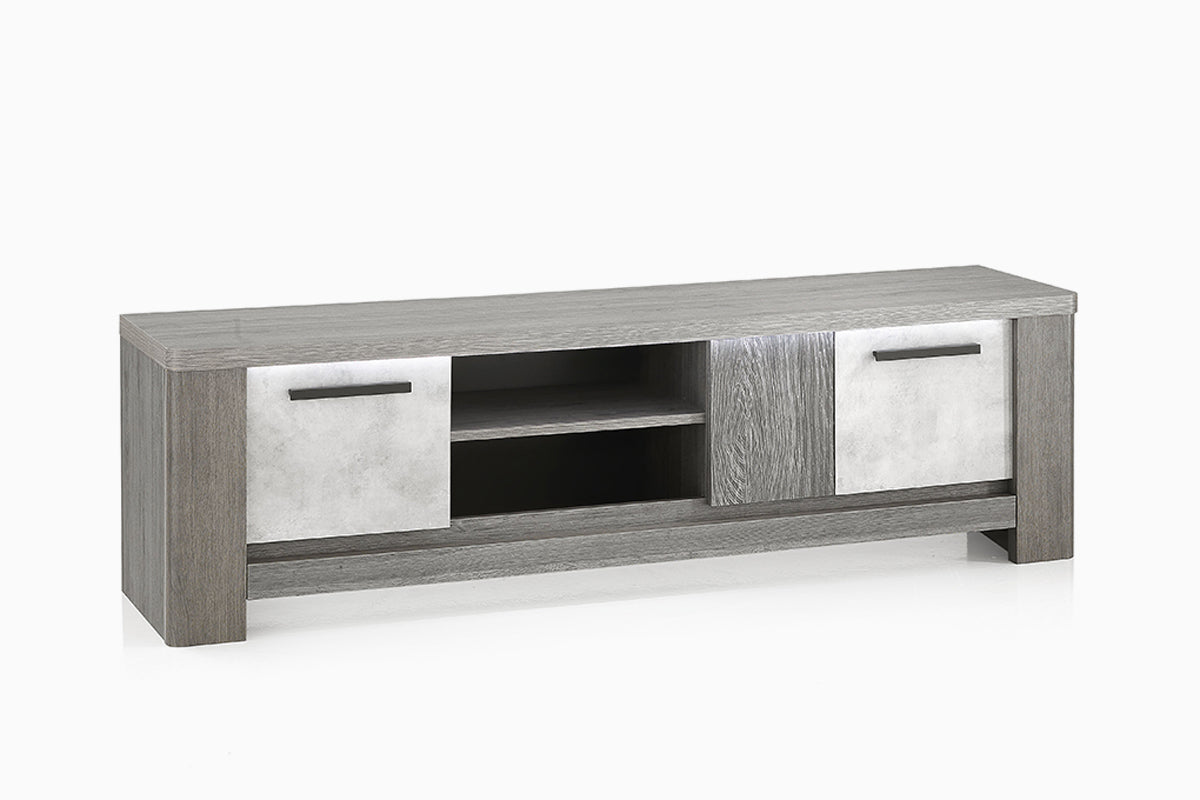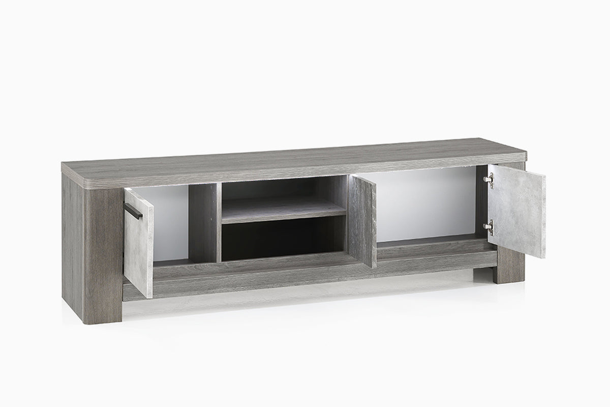 TV staliukas Bolzo yra modernus ir praktiškas baldas, puikiai tinkantis svetainės erdvei. Jo dizainas sujungia medžio tekstūros paviršių su šviesiomis, bet subtiliai kontrastuojančiomis durelėmis. Staliukas turi dvi uždaras spinteles ir atvirą lentyną, kurioje patogu laikyti televizoriaus priedus ar kitą įrangą. Paprasta forma ir neutrali spalvų gama leidžia šį baldą lengvai priderinti prie įvairių interjerų, suteikiant kambariui tvarkos ir jaukumo.