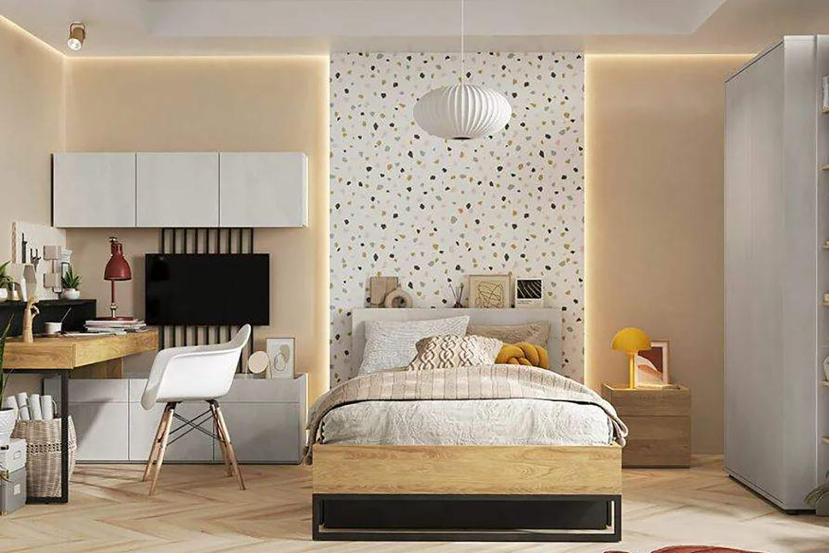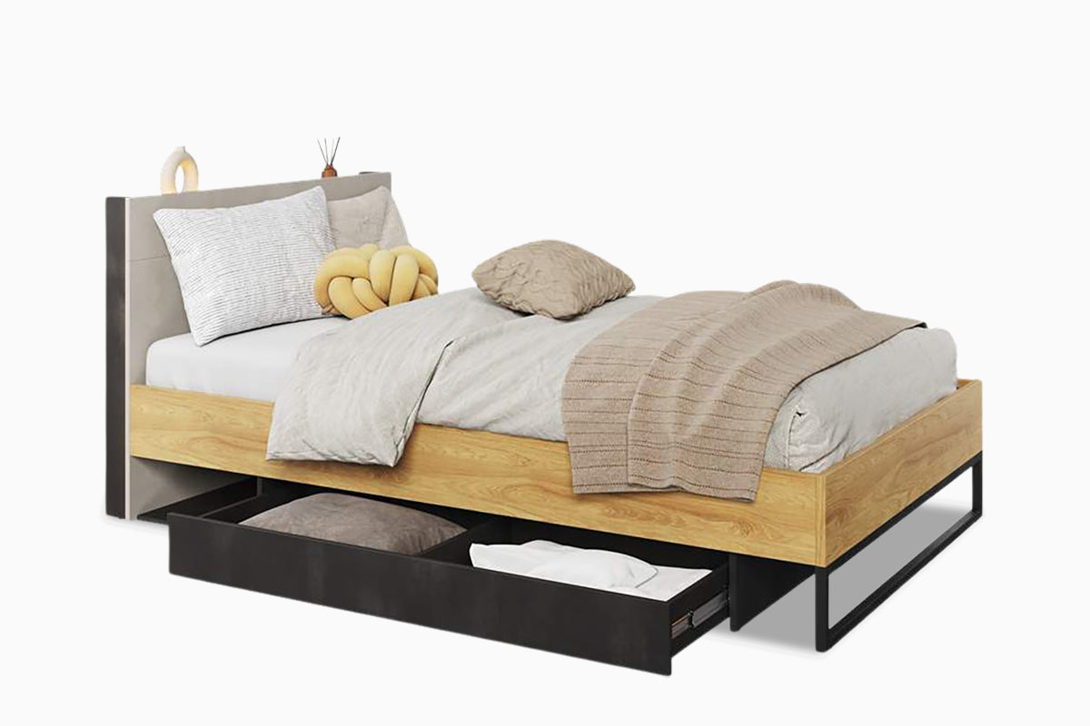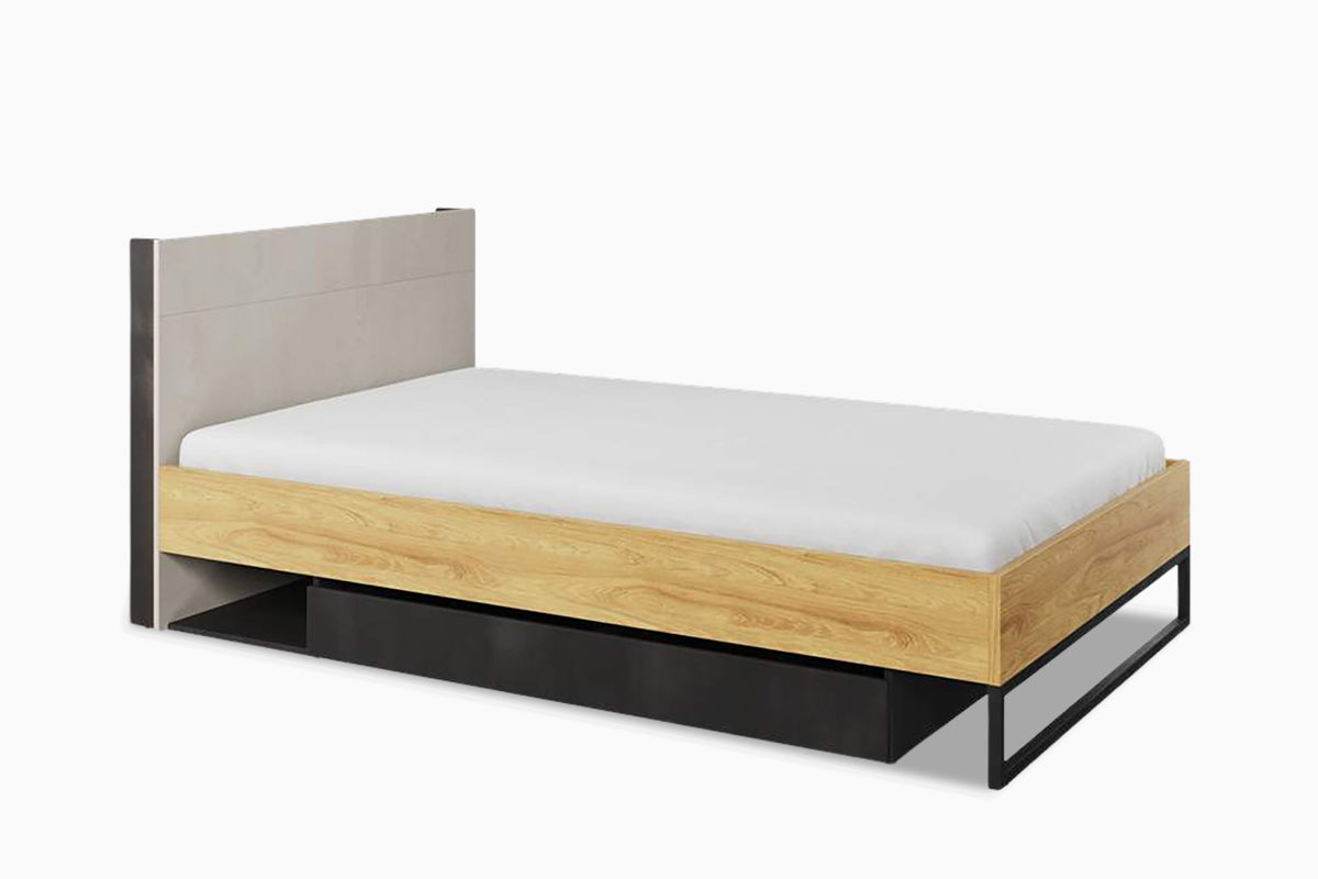 Lova Telana išsiskiria moderniu dizainu – medžio atspalviai derinami su juodomis metalinėmis kojomis, suteikiančiomis subtilų industrinį charakterį. Po lova esantis erdvus ištraukiamas stalčius suteikia papildomos vietos daiktams, o tvirta konstrukcija ir minimalistinės formos puikiai tinka tiek jaunimo, tiek suaugusiųjų kambariui.