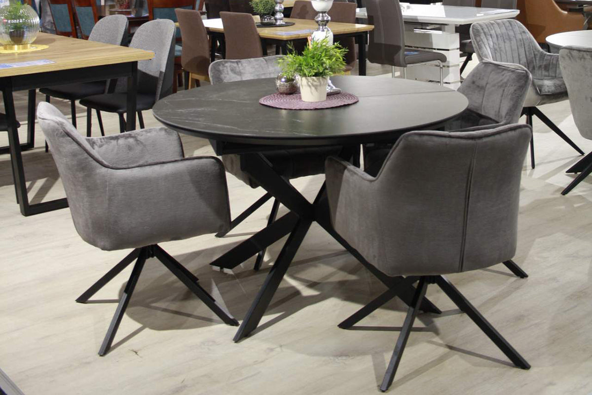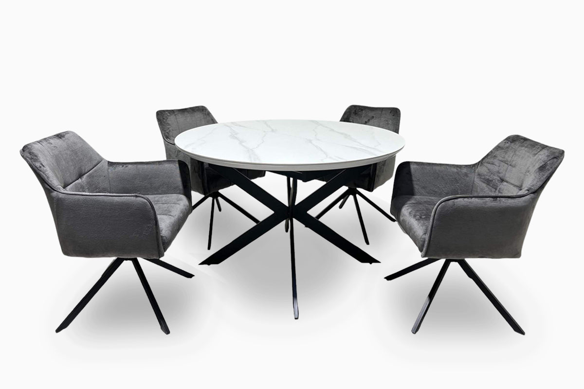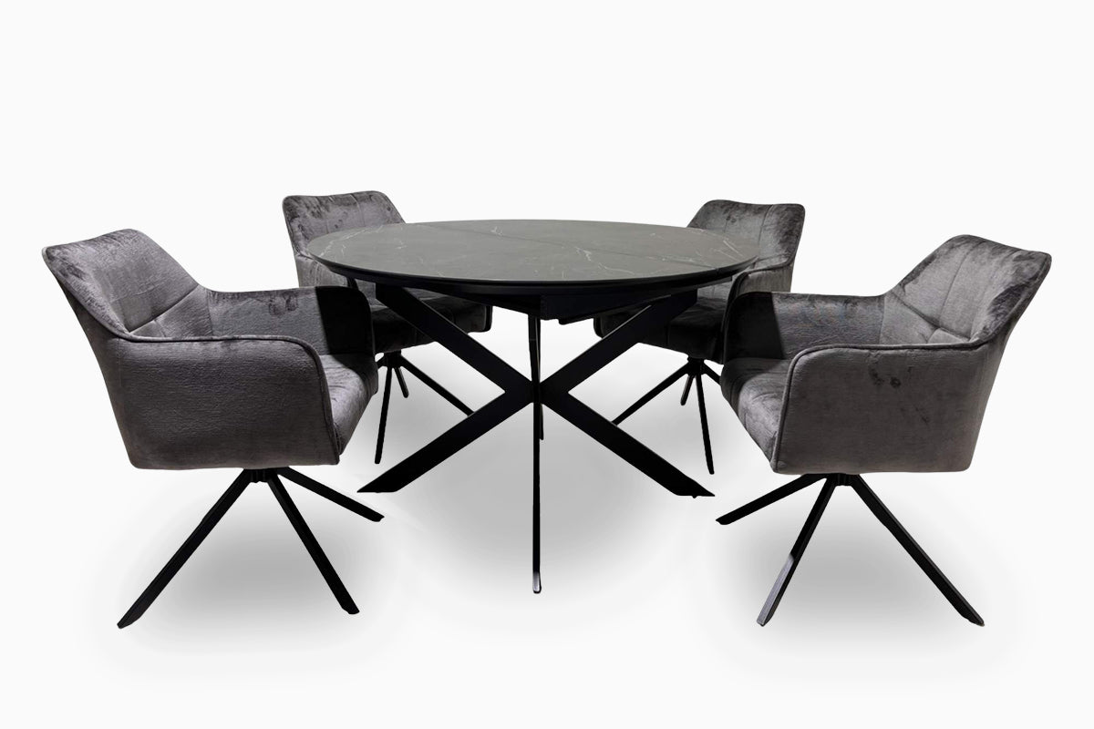 Valgomojo stalo komplektas Solo – tai stilingas ir praktiškas pasirinkimas, kuriame dera modernus dizainas ir funkcionalumas. Komplektą sudaro apvalus valgomojo stalas bei keturios patogios kėdės su minkštu aksominiu audiniu. Stabilus juodo metalo rėmas suteikia tvirtumo, o ergonomiška kėdžių forma su porankiais užtikrina komfortą sėdint tiek kasdien, tiek ypatingų vakarienių metu.