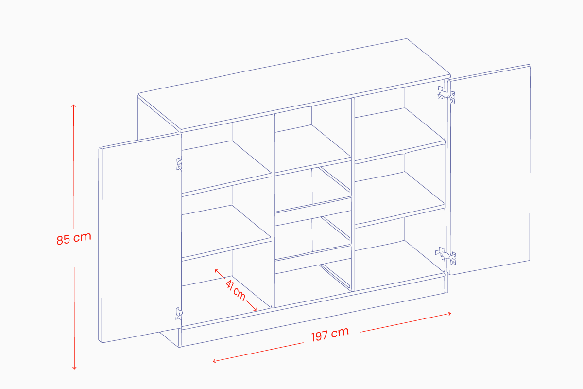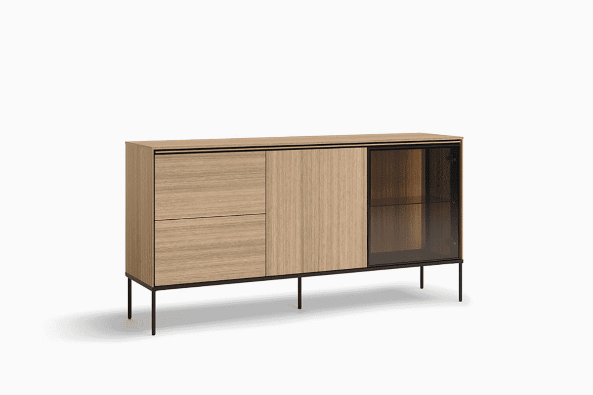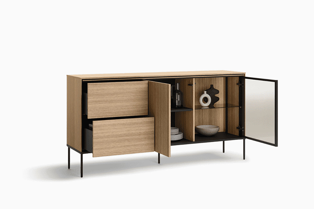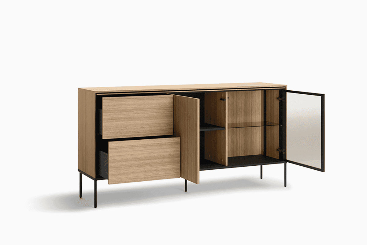 Vibro II komoda išsiskiria moderniu, lengvu dizainu ir natūralaus medžio imitacijos faktūra, kuri interjerui suteikia šilumos ir jaukumo. Kontrastuojantis juodo metalo pagrindas ir subtilios griežtos linijos sukuria šiuolaikišką charakterį, o skaidrus stiklo fasadas leidžia estetiškai eksponuoti indus ar dekoratyvias detales.