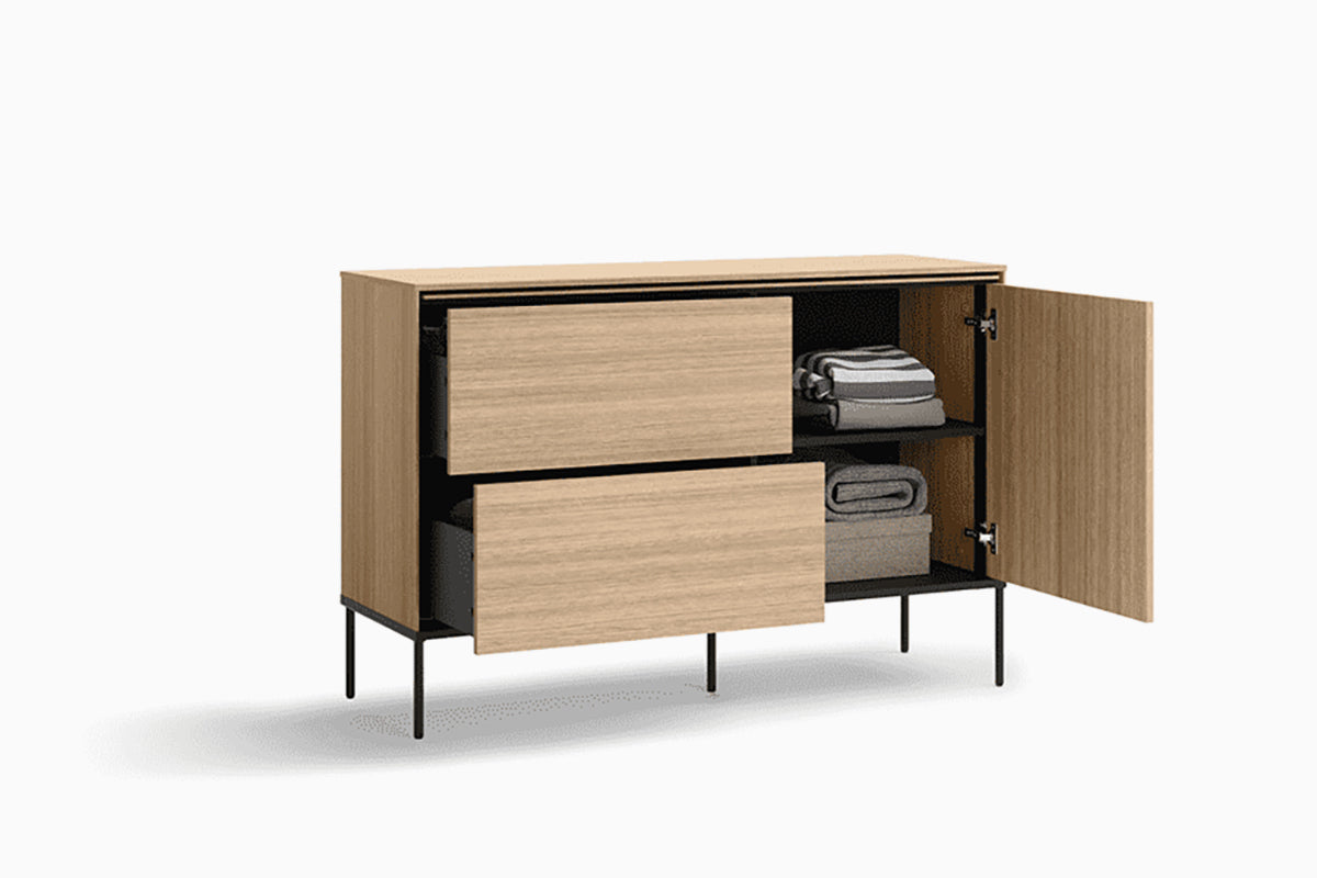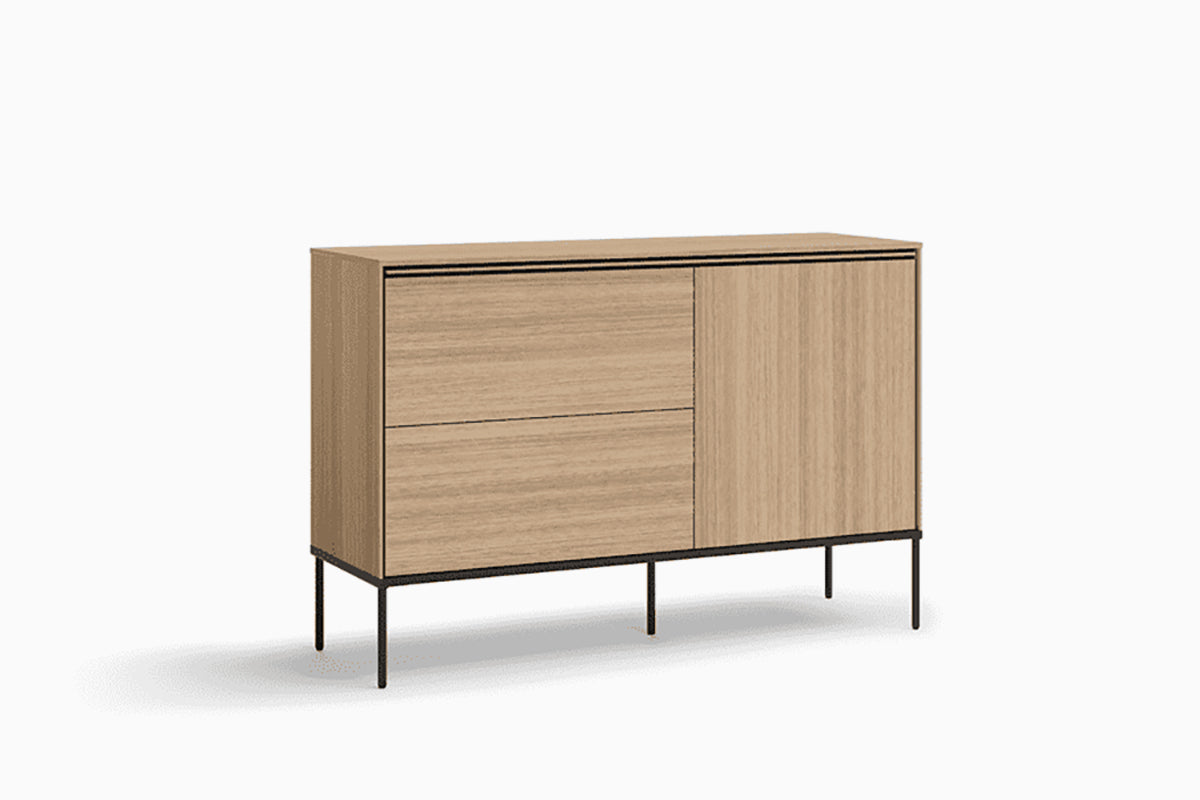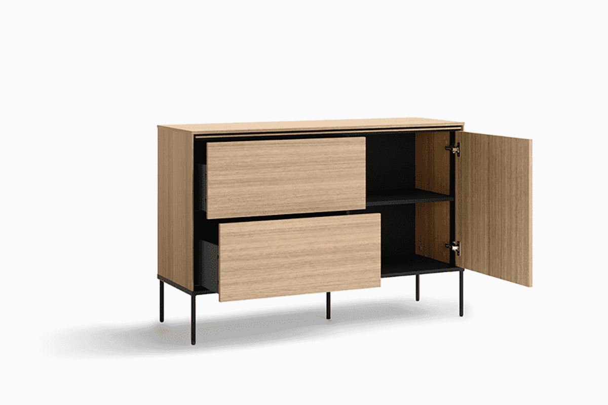 Vibro III komoda – tai baldas, kuriame natūralaus medžio imitacijos paviršiai harmoningai susilieja su lengva, minimalistine juodo metalo konstrukcija. Švarios formos, aukštos plonos kojelės ir subtili spalvų dermė suteikia komodai modernų, lengvą ir elegantišką įvaizdį, kuris puikiai tinka tiek svetainei, tiek miegamajam ar valgomajam.