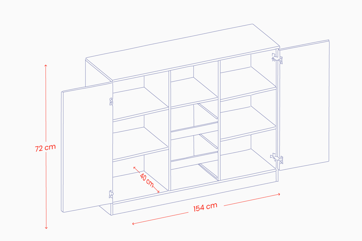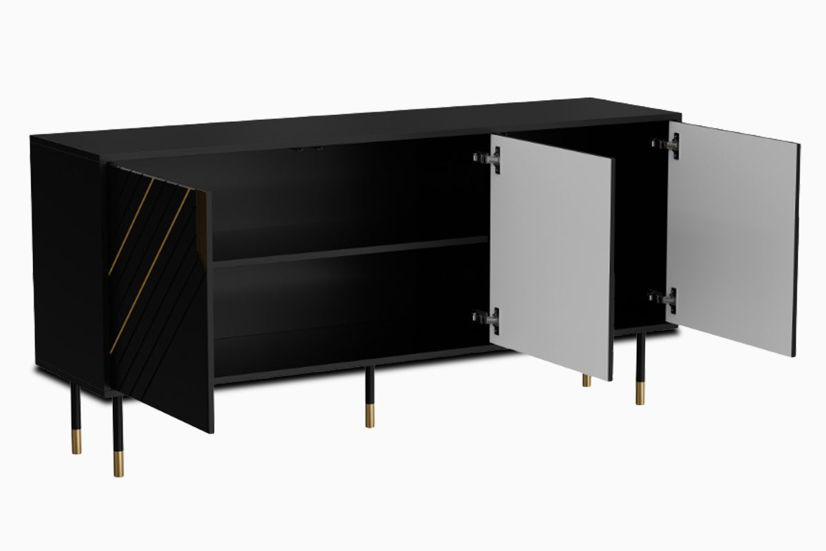 Trejos durys slepia talpią vidinę erdvę su lentynomis, leidžiančiomis patogiai laikyti įvairius daiktus – nuo indų iki tekstilės. Plonos, juodos kojelės su aukso spalvos galiukais suteikia baldui lengvumo ir elegancijos. Komoda puikiai tinka šiuolaikiškiems interjerams, ypač tiems, kuriuose siekiama ryškaus, tačiau subtilaus stiliaus.