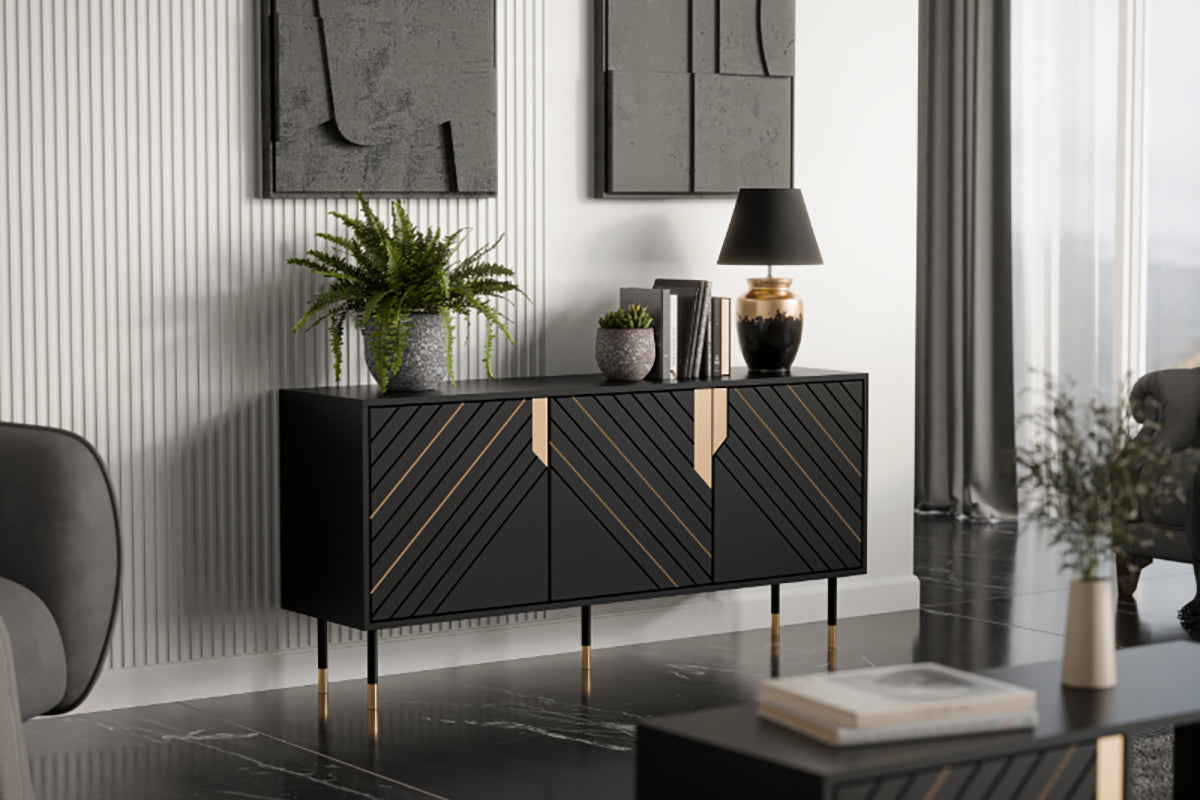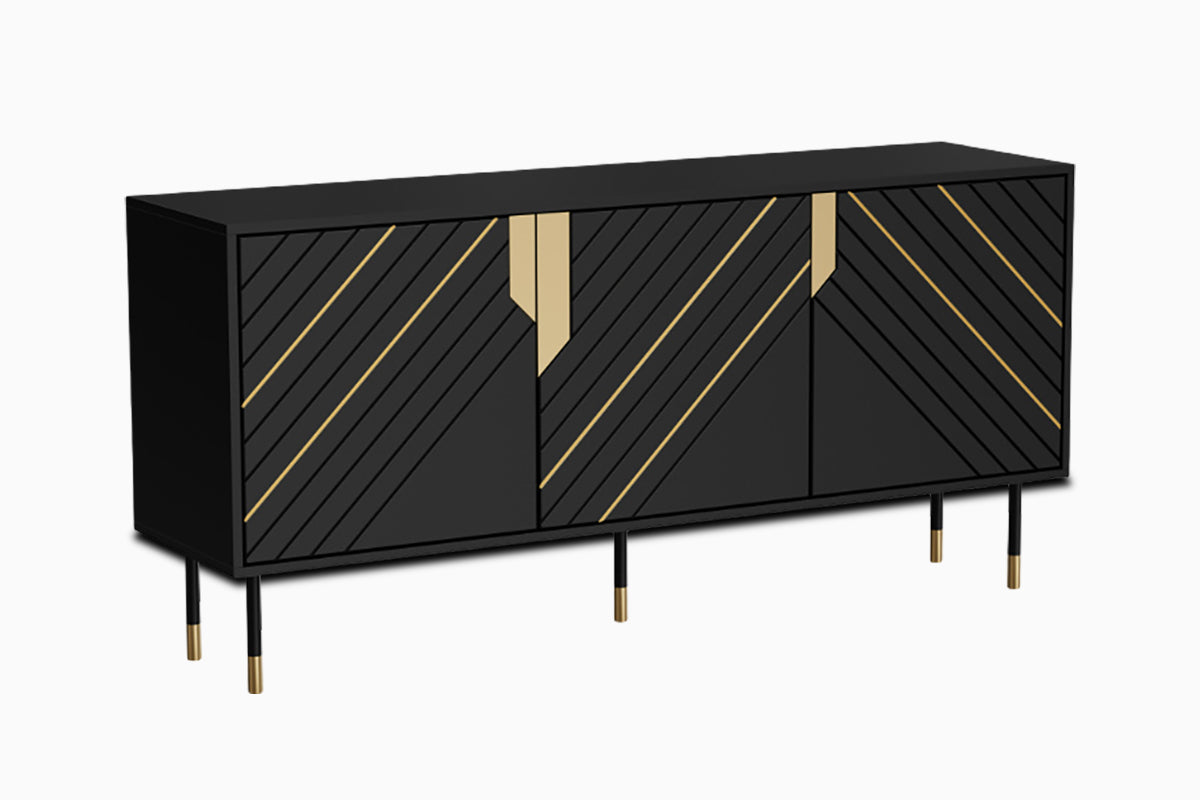 Everest – moderni komoda su dekoratyviu fasadu, kuriame derinami juodi matiniai paviršiai su subtiliomis aukso spalvos detalėmis. Įstrižų linijų ornamentika sukuria geometrinį ritmą, išsiskiriantį rafinuotu dizainu ir vizualiniu dinamizmu.