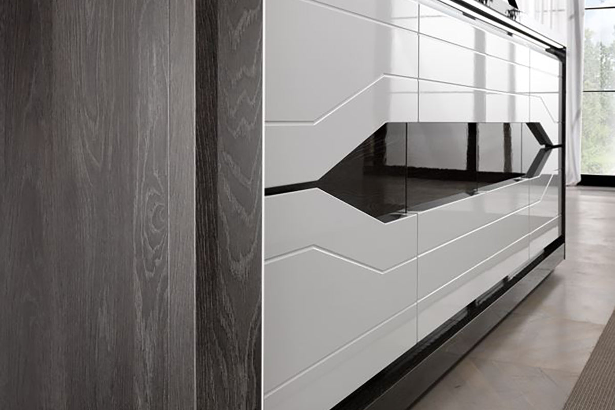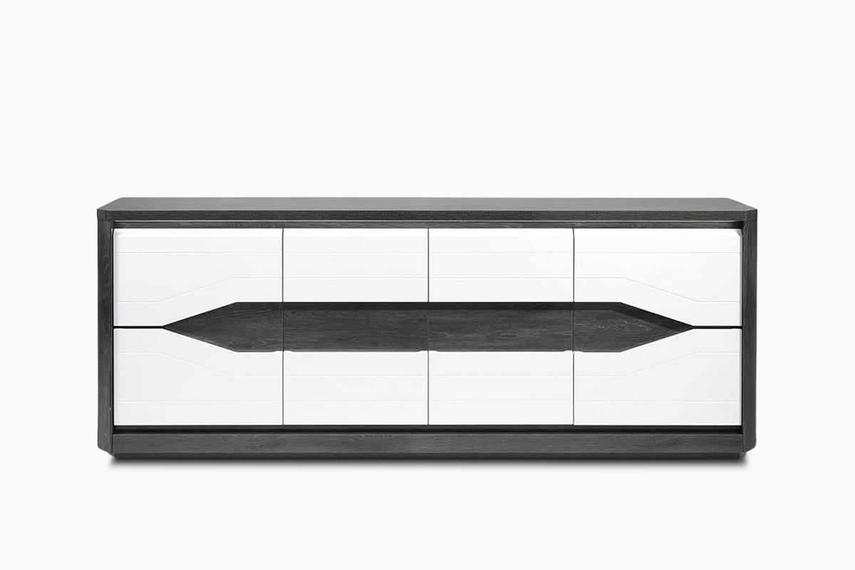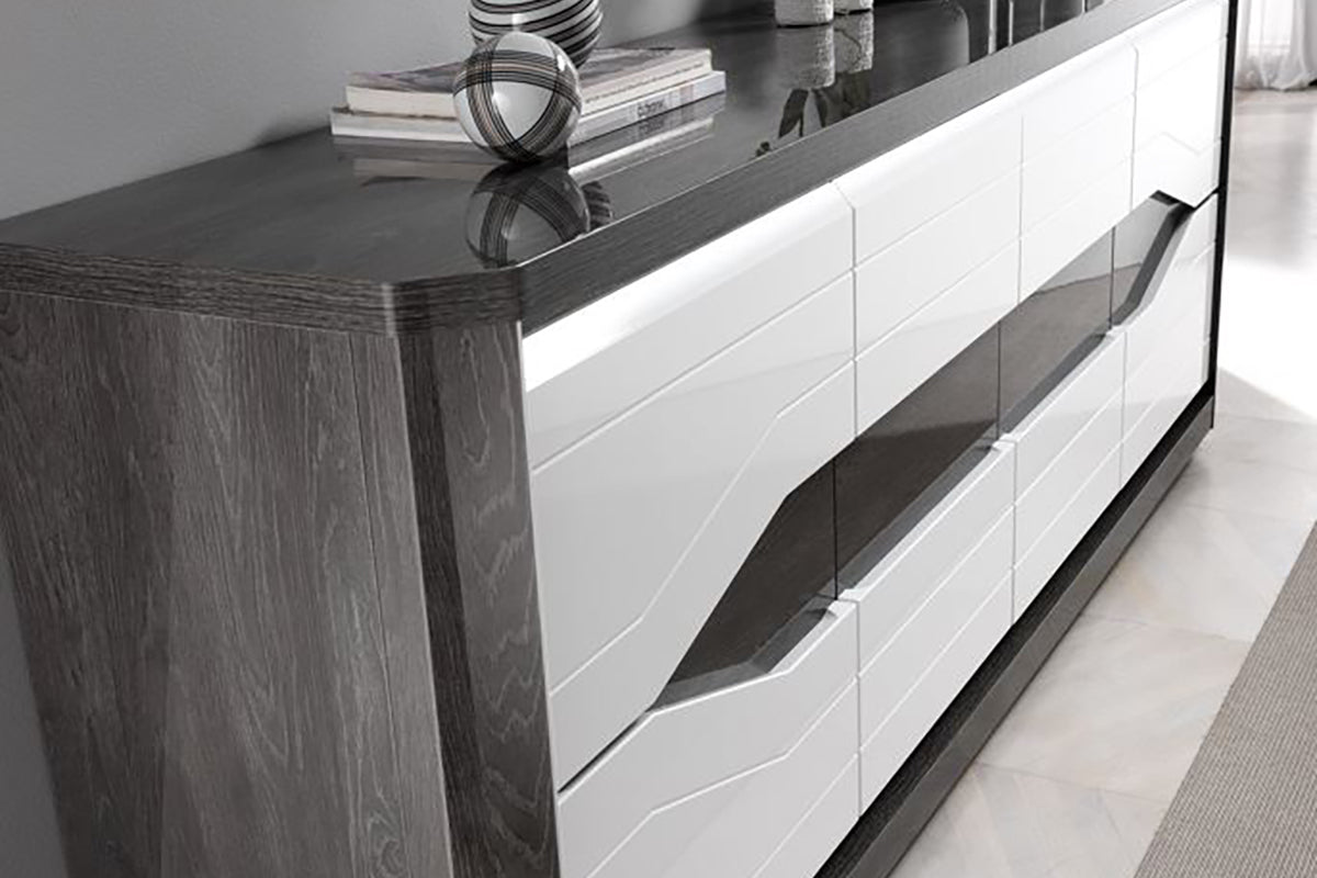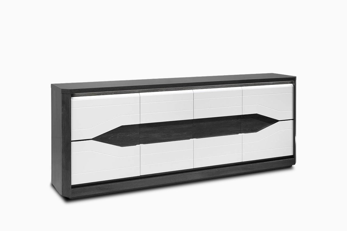 Komoda Mateo – modernus ir elegantiškas baldas, suteikiantis interjerui išskirtinumo bei funkcionalumo. Tamsaus medžio spalvos korpusas harmoningai dera su blizgiais baltais fasadais, kuriuos pagyvina subtilūs geometriniai akcentai.