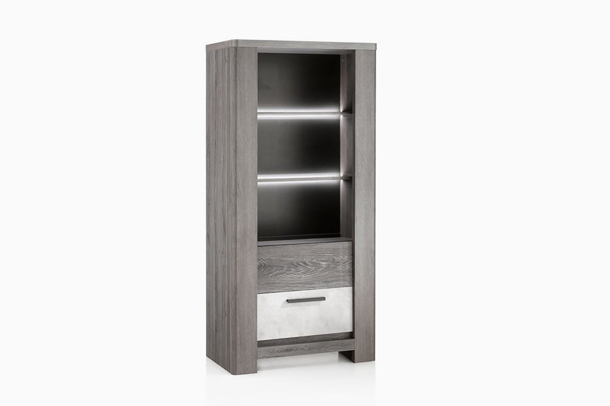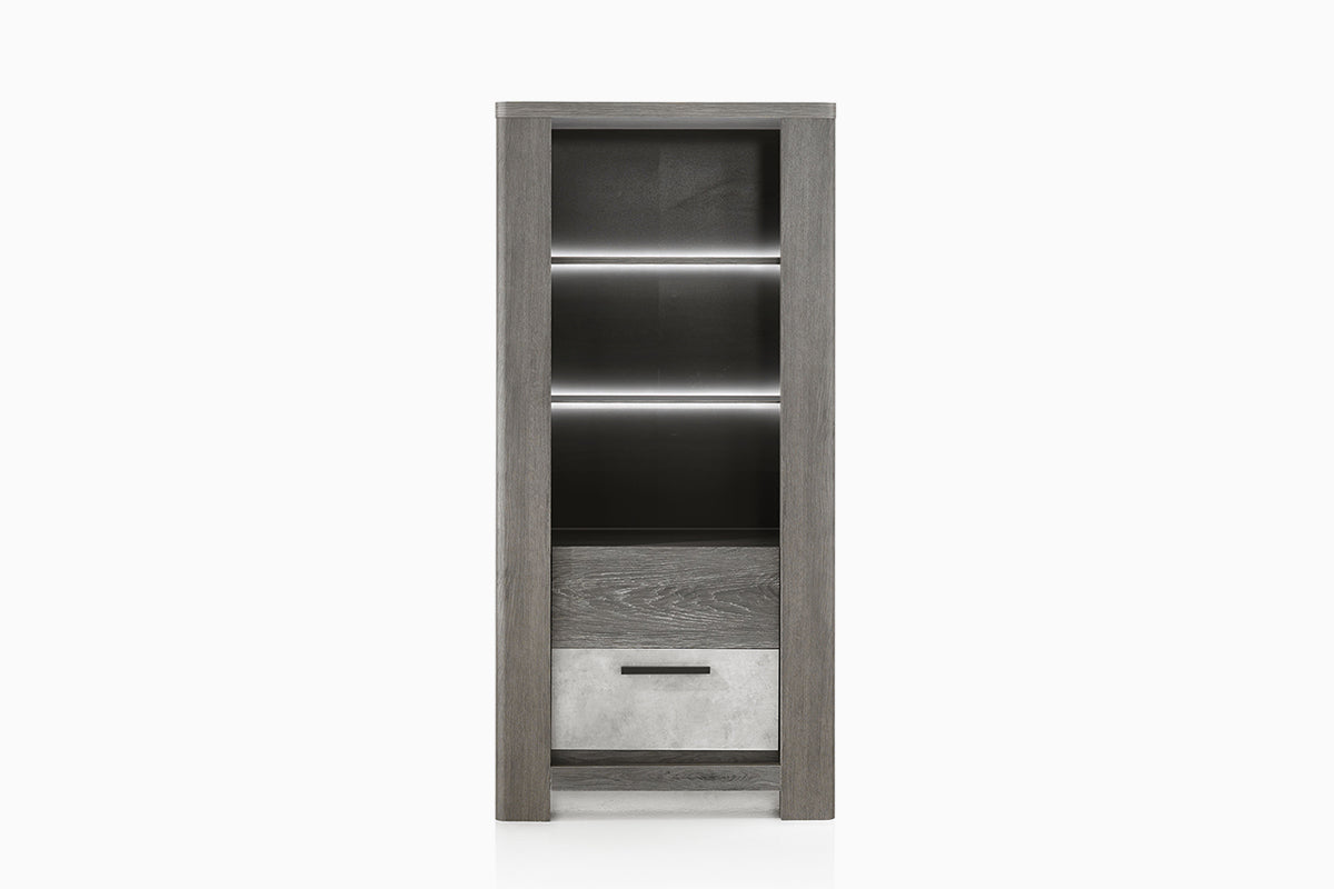 Lentyna Bolzo – modernus ir stilingas baldas, suteikiantis interjerui išskirtinumo ir praktiškumo. Lentynos su LED apšvietimu puikiai išryškina mėgstamiausius daiktus ar dekoracijas, o apačioje esantys stalčiai suteikia papildomos vietos laikyti smulkmenoms. Medžio tekstūra derinama su šviesiais akcentais kuria elegantišką kontrastą, todėl ši vitrina lengvai įsilies tiek į modernų, tiek į klasikinį interjerą. Tai patogus sprendimas norintiems sujungti estetiką ir funkcionalumą savo namuose.