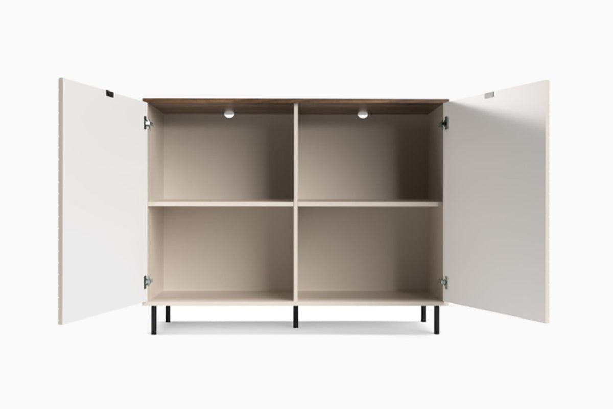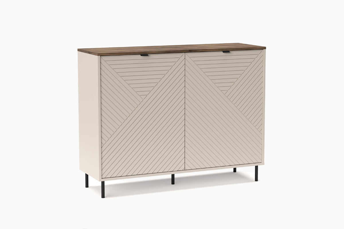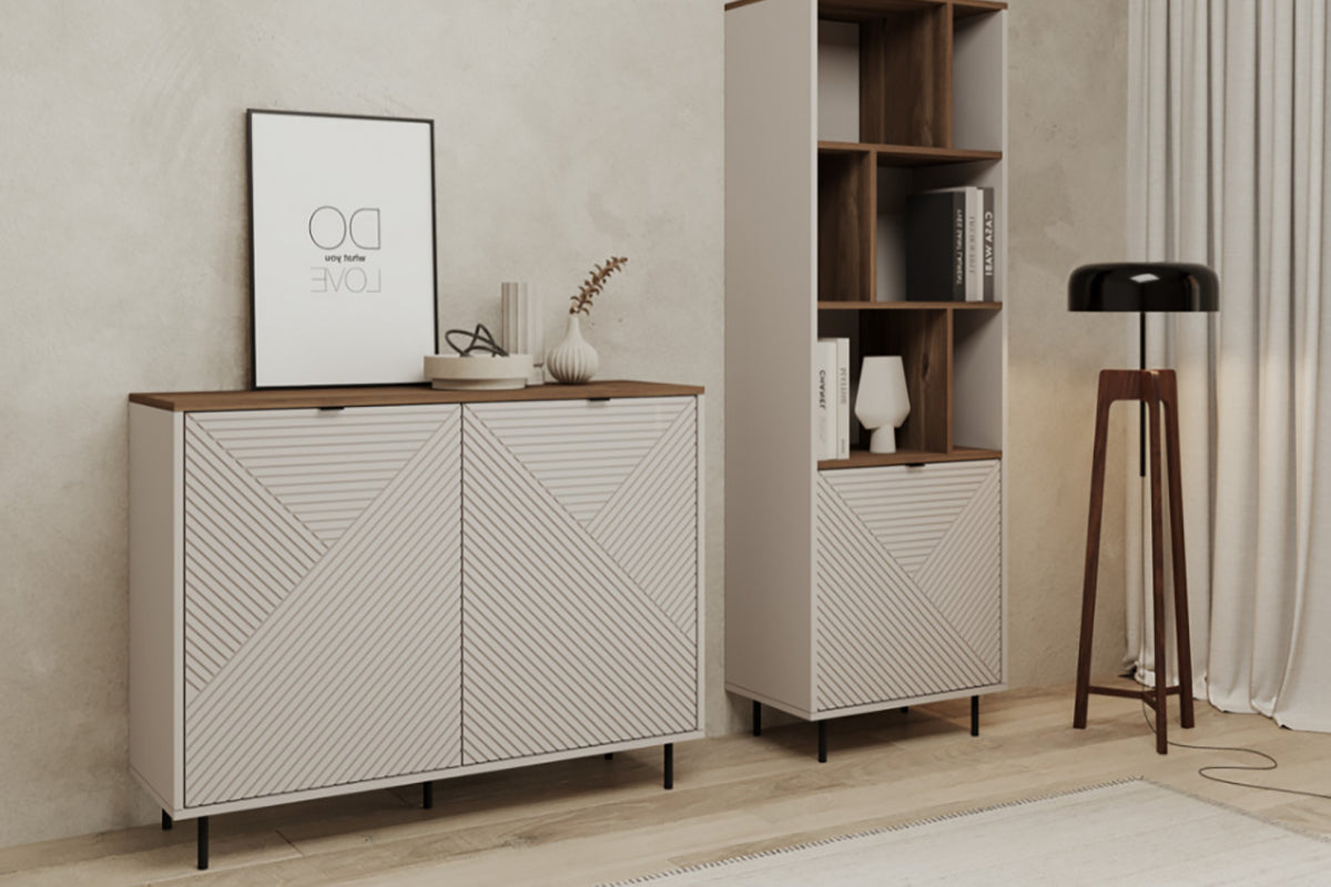 Komoda Hindi – tai minimalistinio dizaino baldas, išsiskiriantis subtiliu geometriniu raštu ant durelių. Šviesus korpusas, derinamas su medžio imitacijos viršumi ir juodomis kojelėmis, suteikia interjerui šiuolaikiško jaukumo. Erdvūs skyriai viduje leidžia patogiai susidėti daiktus, o dizaino vientisumas puikiai dera tiek moderniame, tiek klasikinio stiliaus kambaryje.