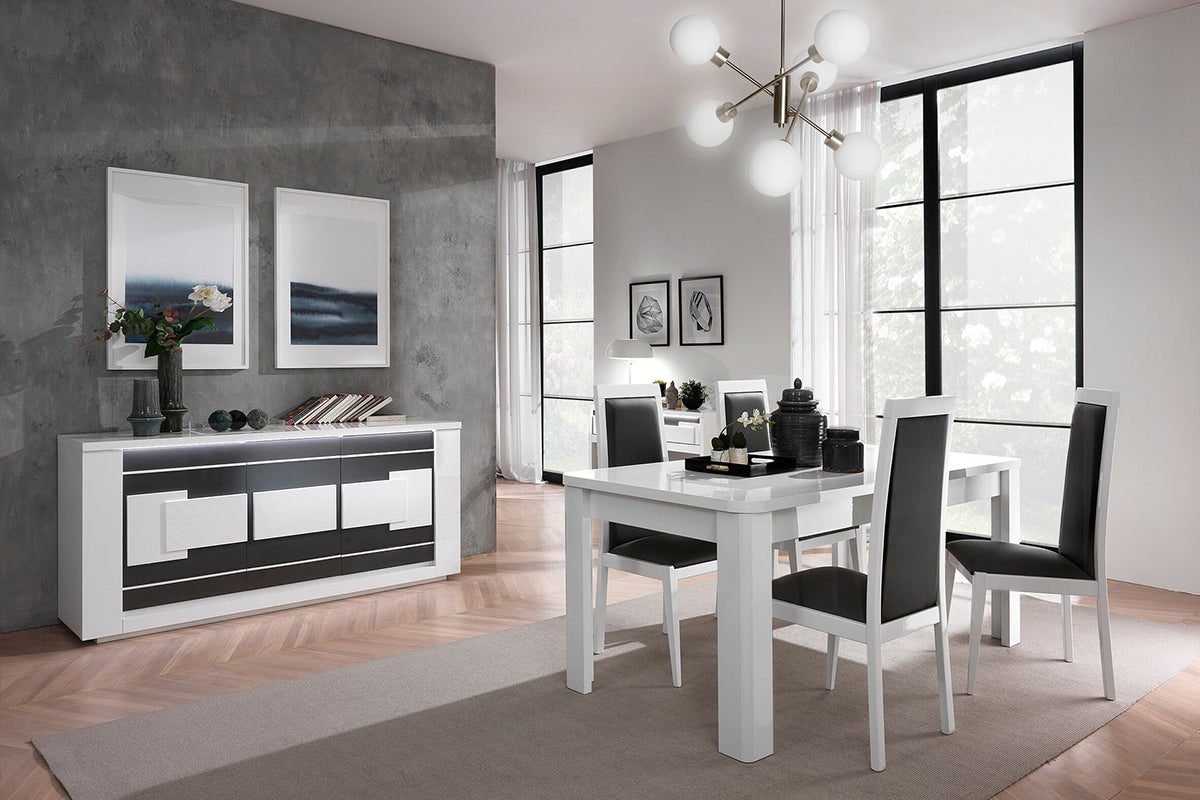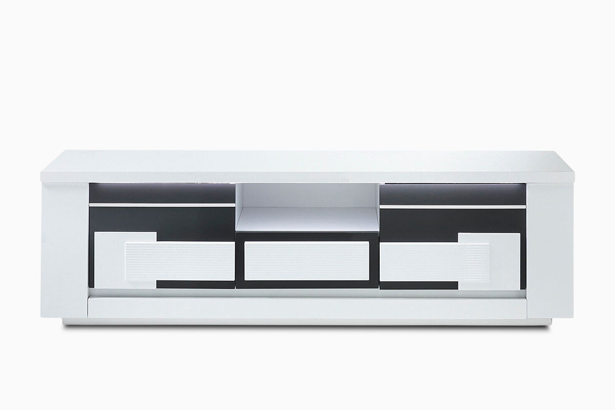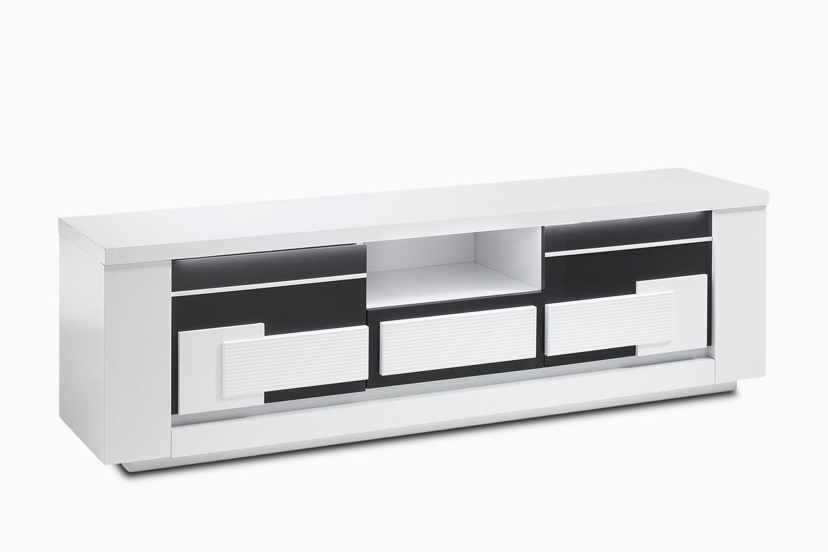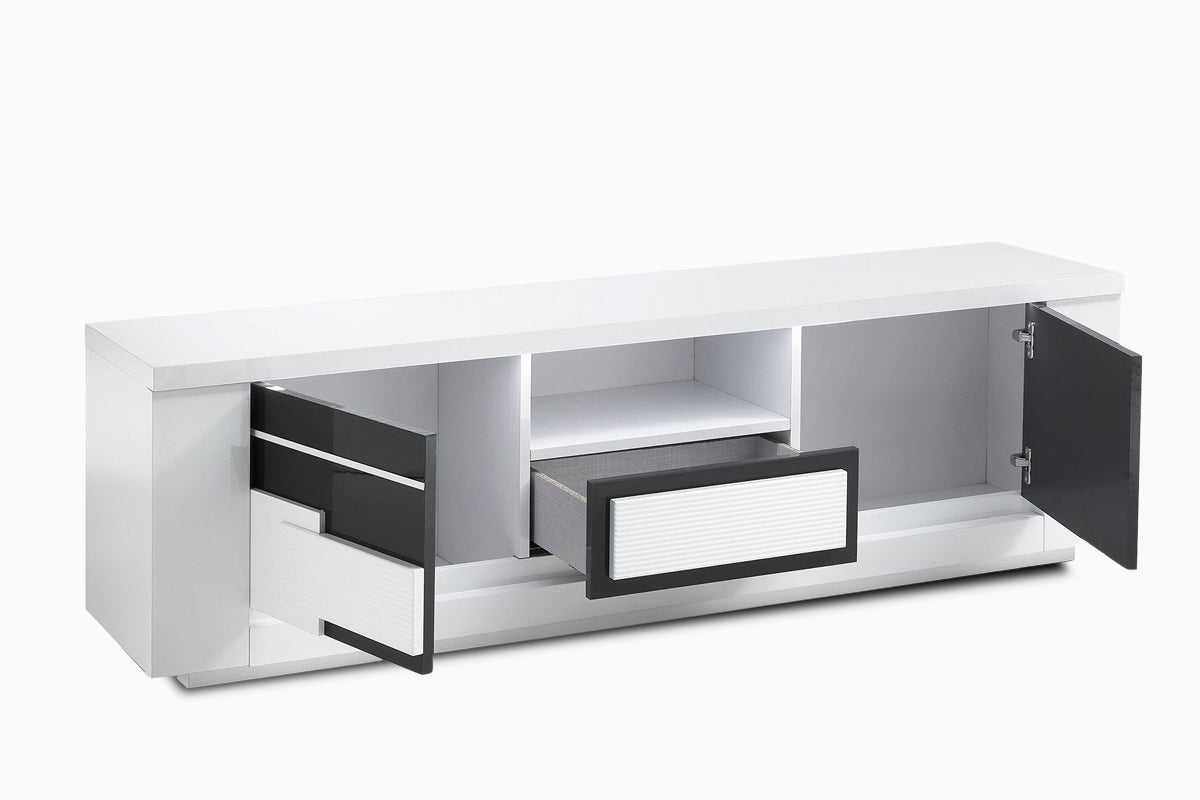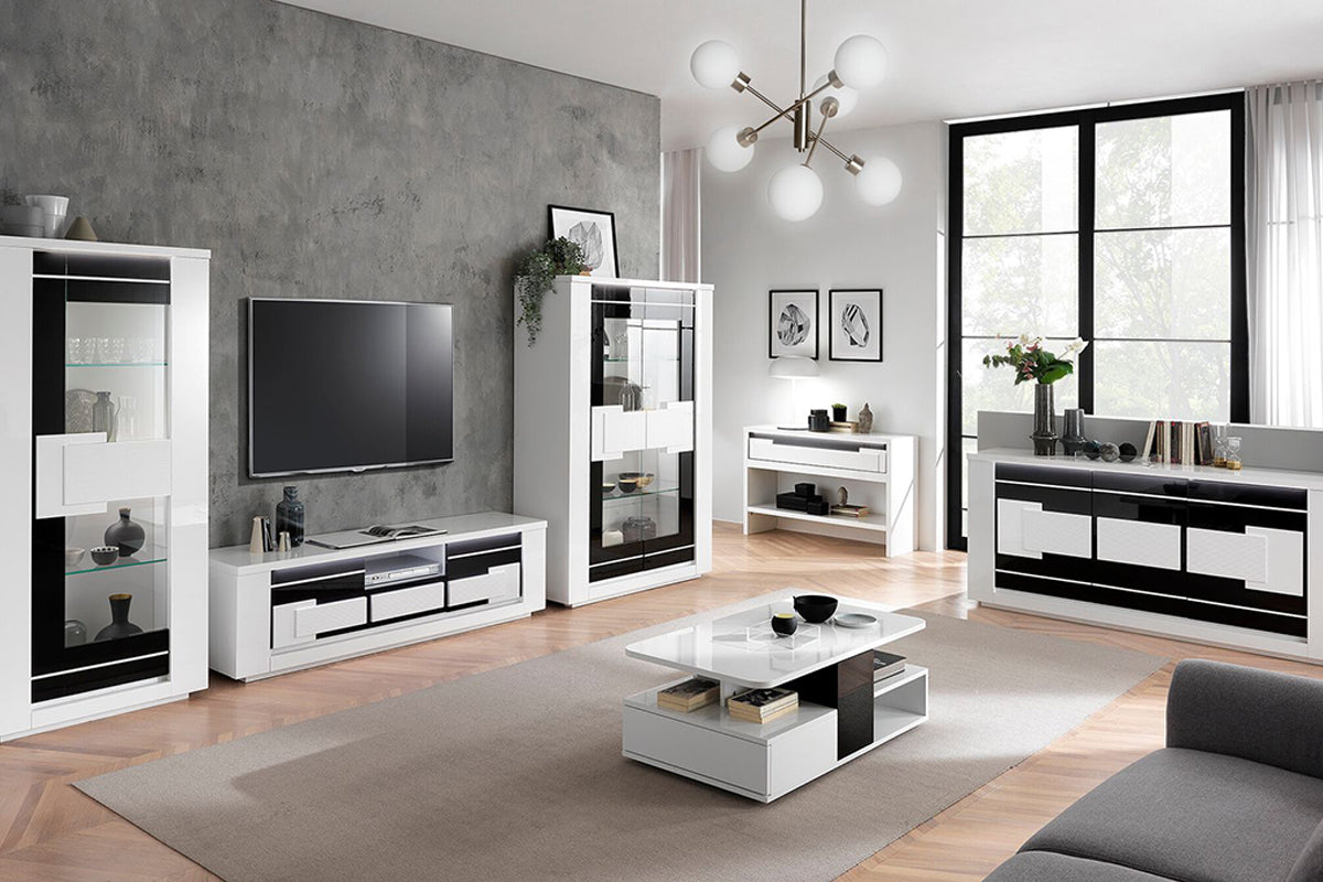 TV staliukas Arriva – tai modernus baldas, derinantis elegantišką stilių ir praktišką funkcionalumą. Blizgi juodos ir baltos spalvų kombinacija suteikia išskirtinį vizualinį efektą, o minimalistinės linijos pabrėžia šiuolaikišką dizainą.