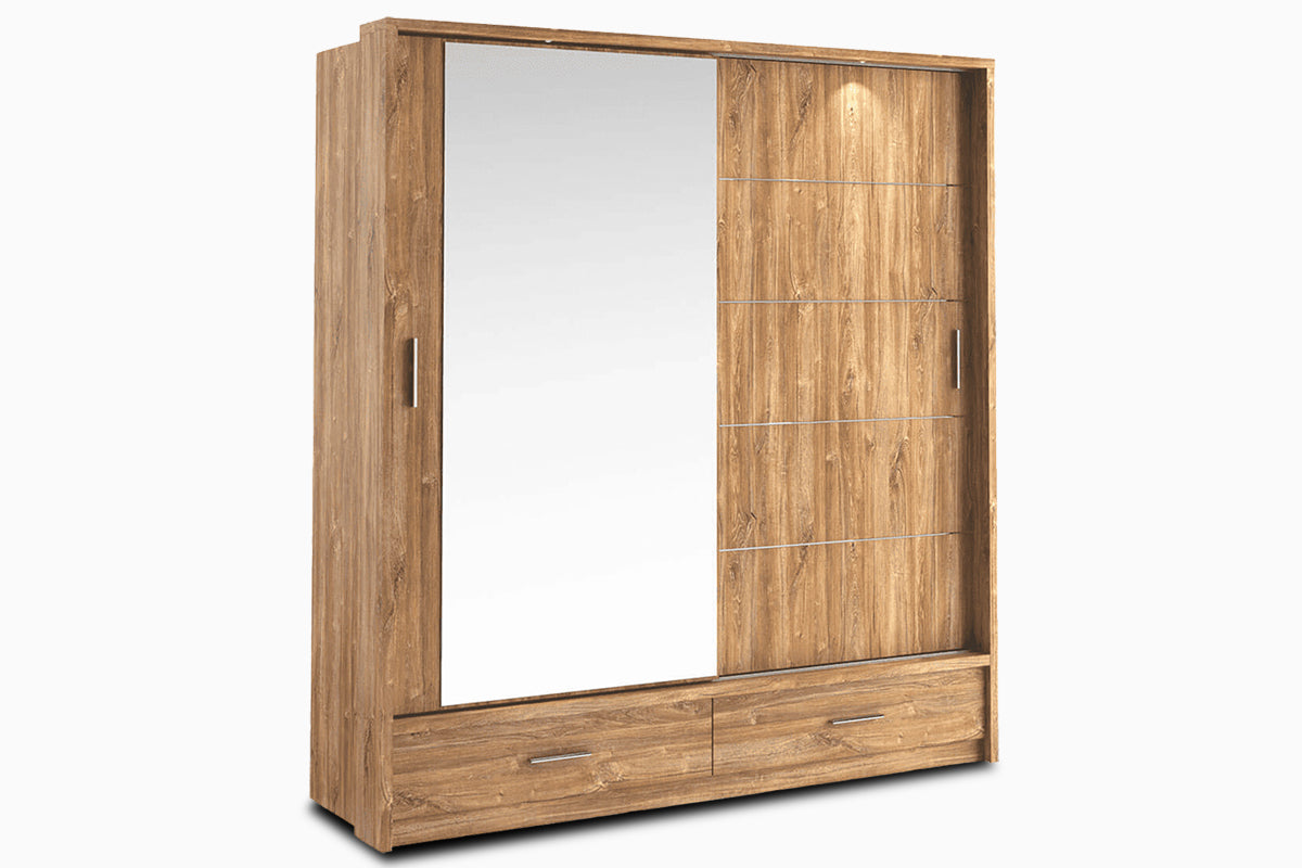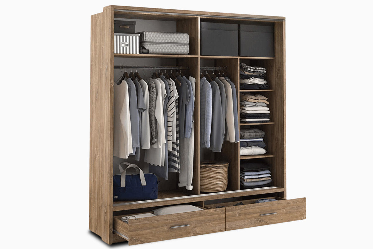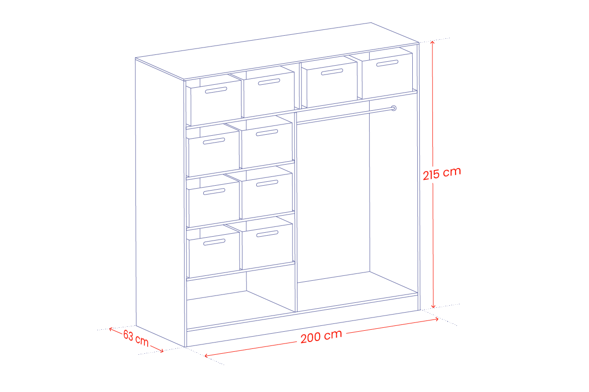 Plašajā interjerā ir divi nodalījumi ar drēbju pakaramo, ietilpīgs plauktu bloks un divas plašas apakšējās atvilktņu zonas — ideāli piemērotas gultasveļai vai sezonas priekšmetiem. Integrētais spogulis ne tikai paplašina telpas sajūtu, bet arī palīdz radīt ērtu rīta rutīnu.