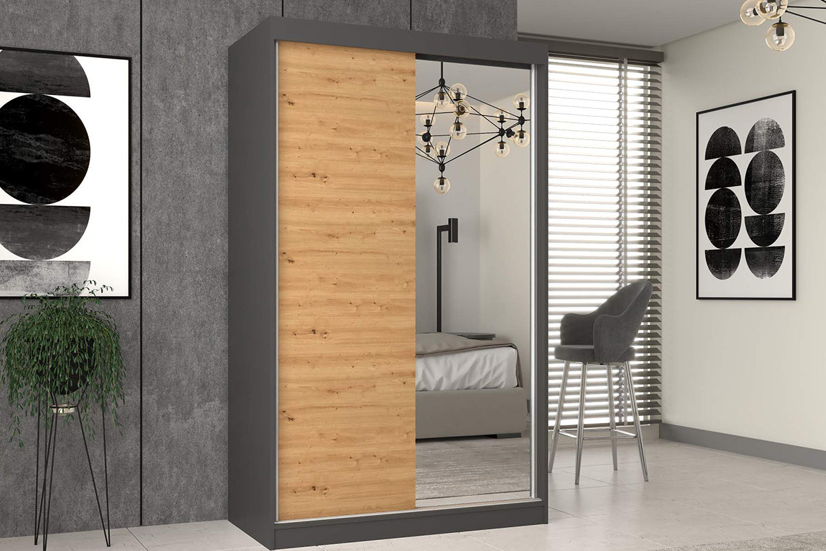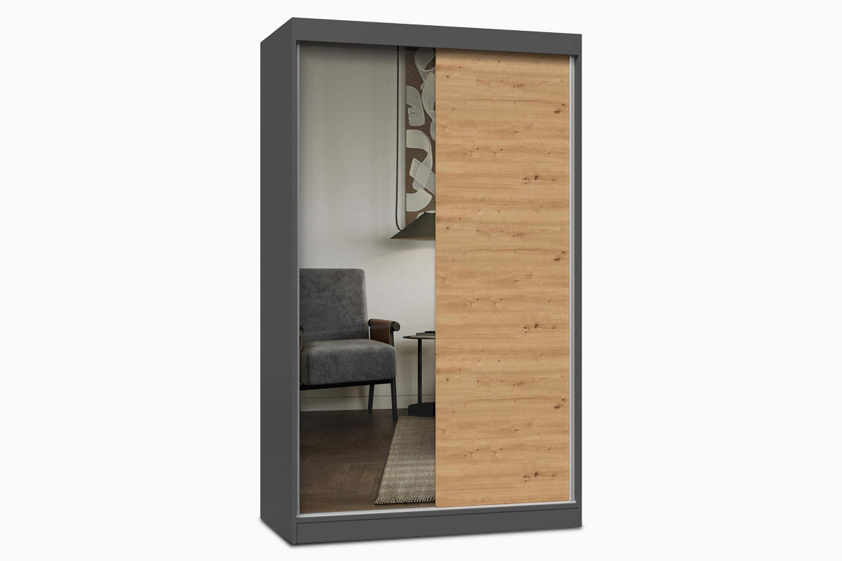Stumdomos durys taupo vietą ir suteikia patogumo, o viena jų puošta dideliu veidrodžiu, kuris vizualiai praplečia kambarį ir įleidžia daugiau šviesos. Medžio rašto ir tamsaus rėmo derinys suteikia spintai modernų, bet kartu jaukų charakterį. Juko – tai baldas, kuris harmoningai įsilieja į įvairaus stiliaus interjerą, suteikdamas namams daugiau tvarkos ir estetikos.