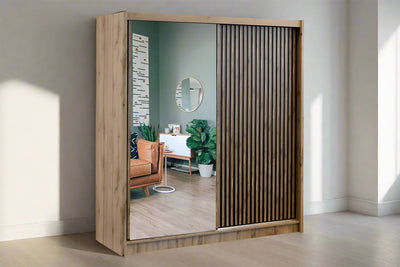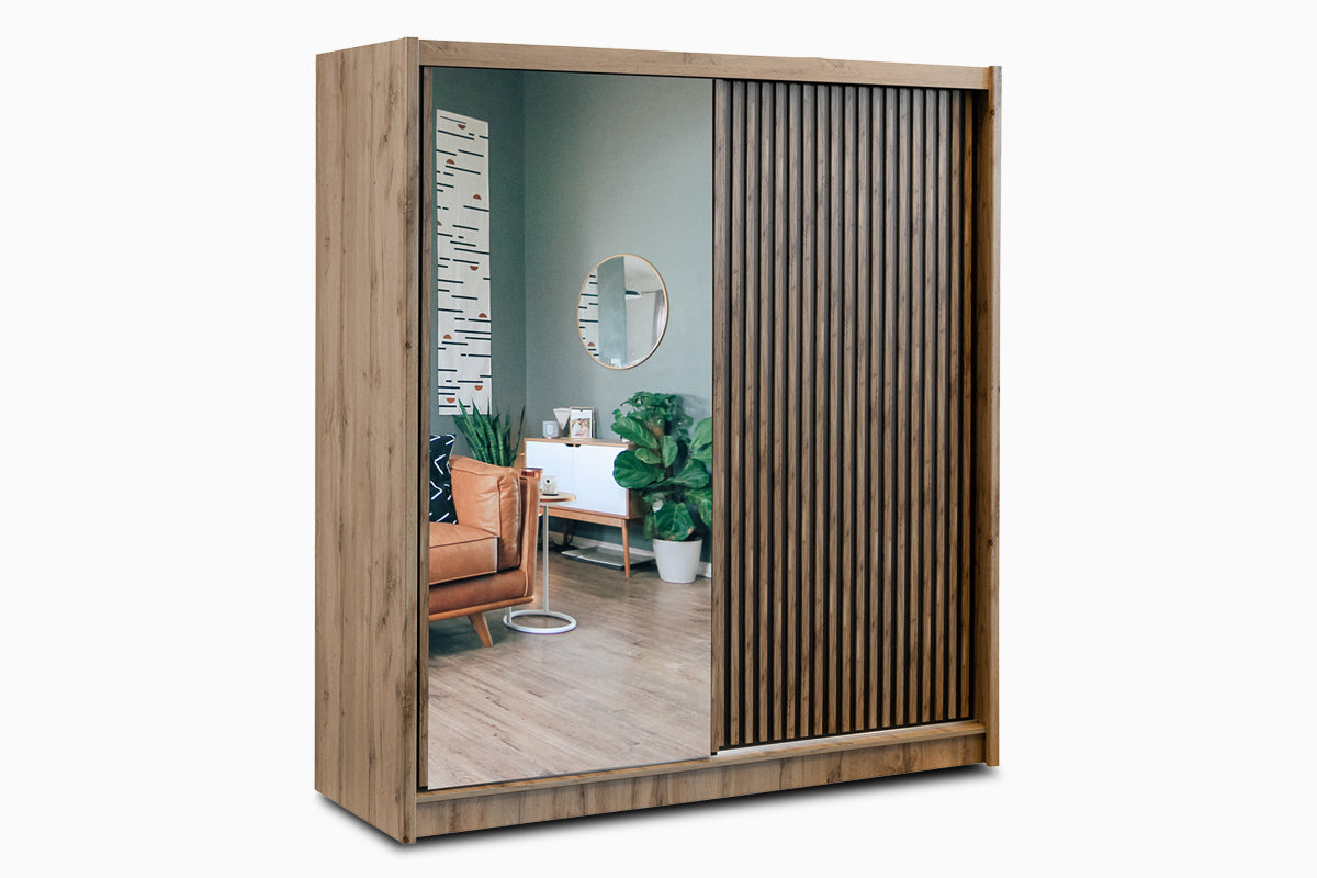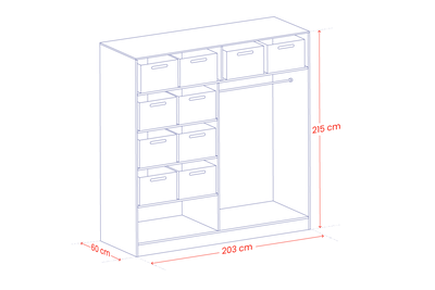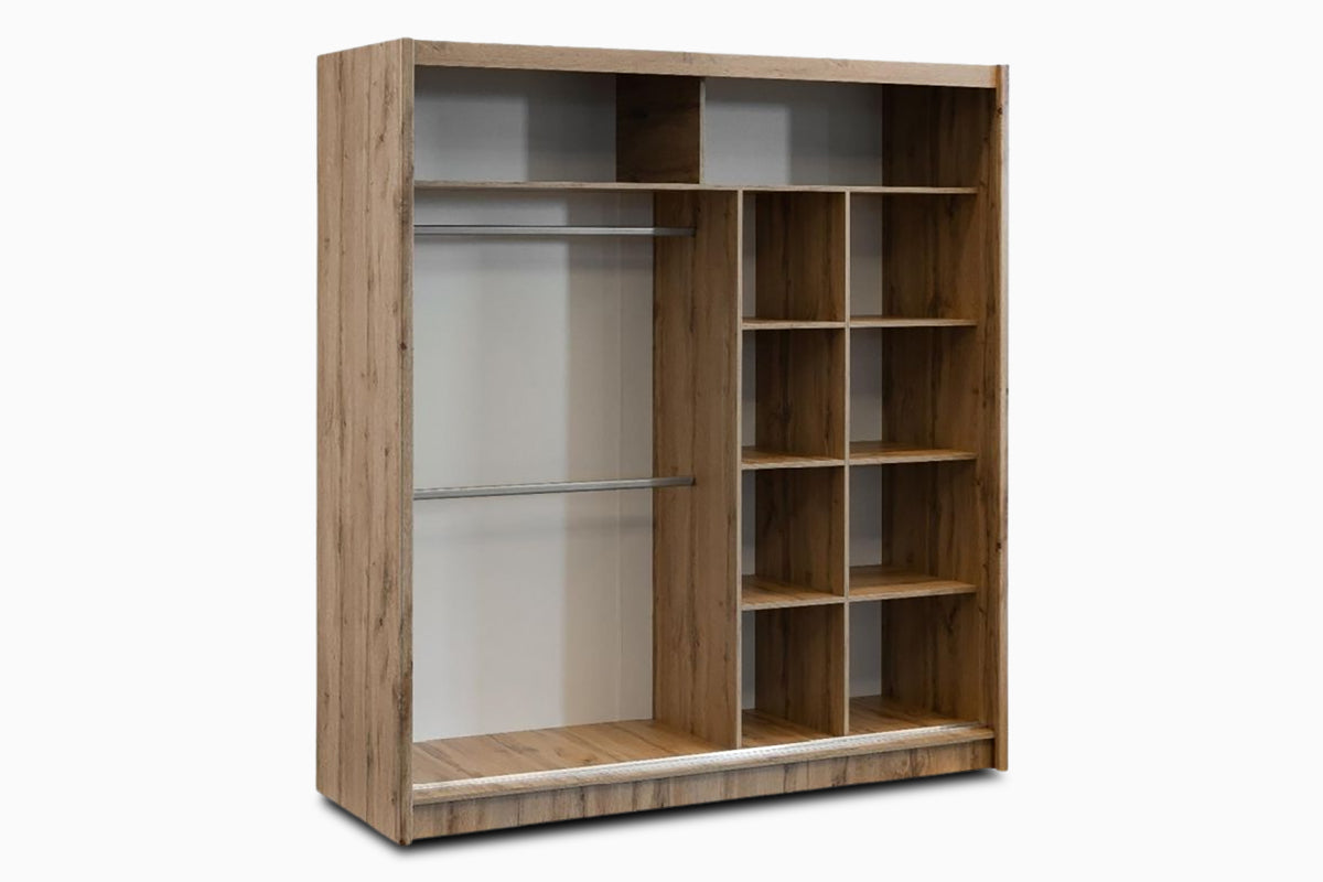 Vidinė struktūra – itin praktiška: du skyriai su drabužių kabyklomis ir net 10 erdvių lentynų, kuriose patogu laikyti drabužius, aksesuarus ar kitus daiktus. Stumdomos durys užtikrina patogų naudojimą net ir mažesnėse erdvėse.