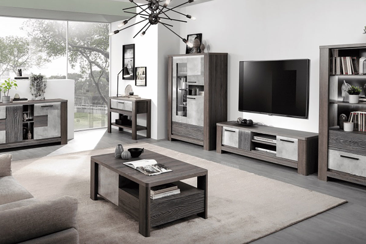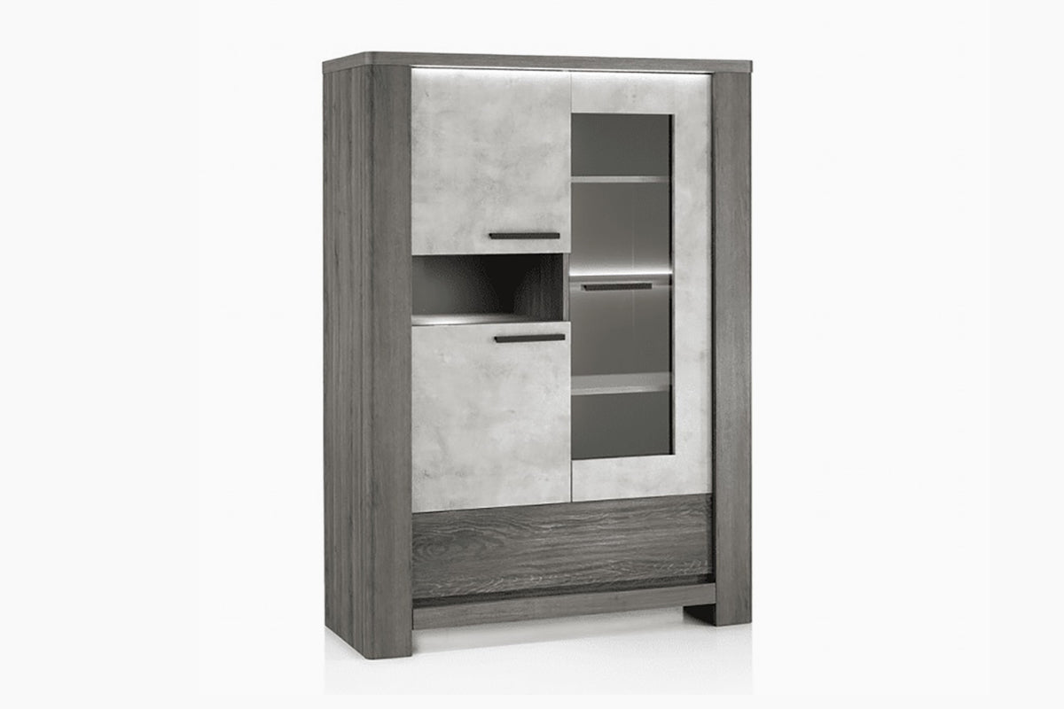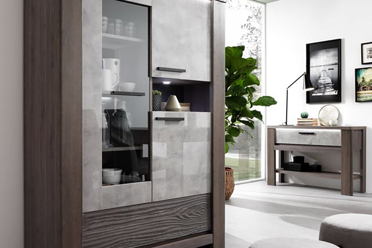 Vitrina Bolzo – tai elegantiškas itališkas baldas, puikiai derinantis modernų stilių su praktiškumu. Kontrastingi fasadai, kuriuose susijungia natūralaus medžio tekstūra, betono imitacija ir stiklo elementai, suteikia šiam baldui šiuolaikišką, tačiau solidų įvaizdį.